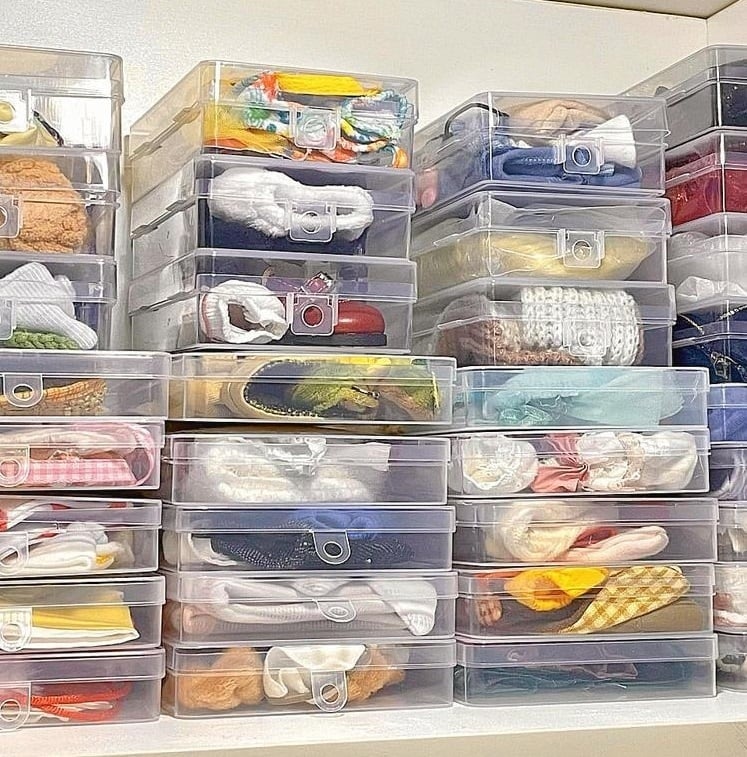 異なるサイズのドール服や小物を整理するために、層ごとに収納できるボックスを使う方法です!