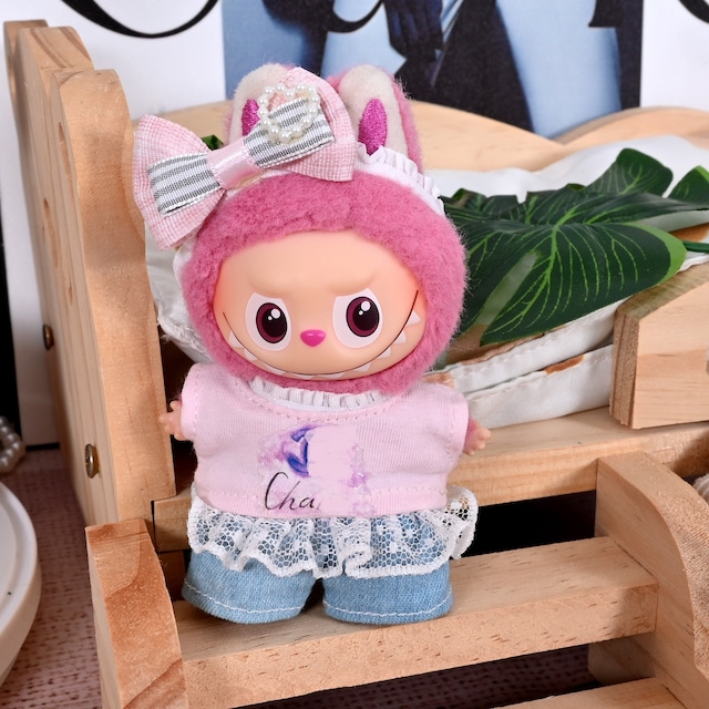 Labubu四代対応 ニットトップス+レースデニムパンツ+リボンヘアアクセ カジュアル ぬいぐるみ服 ピンク 3点セット