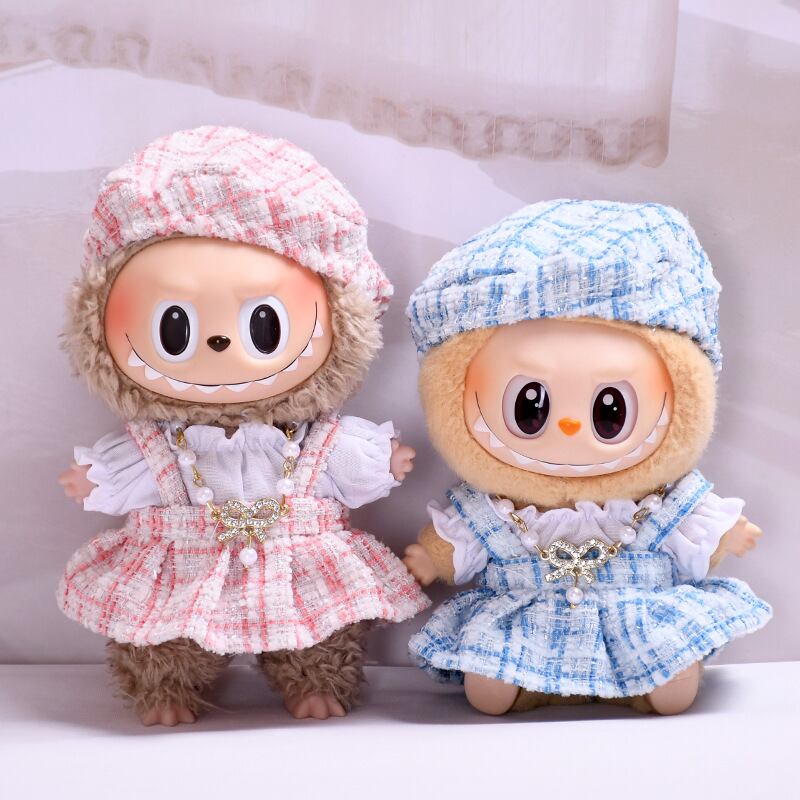 ピンクまたはブルーのチェック柄ジャンパースカートを合わせたガーリースタイル。