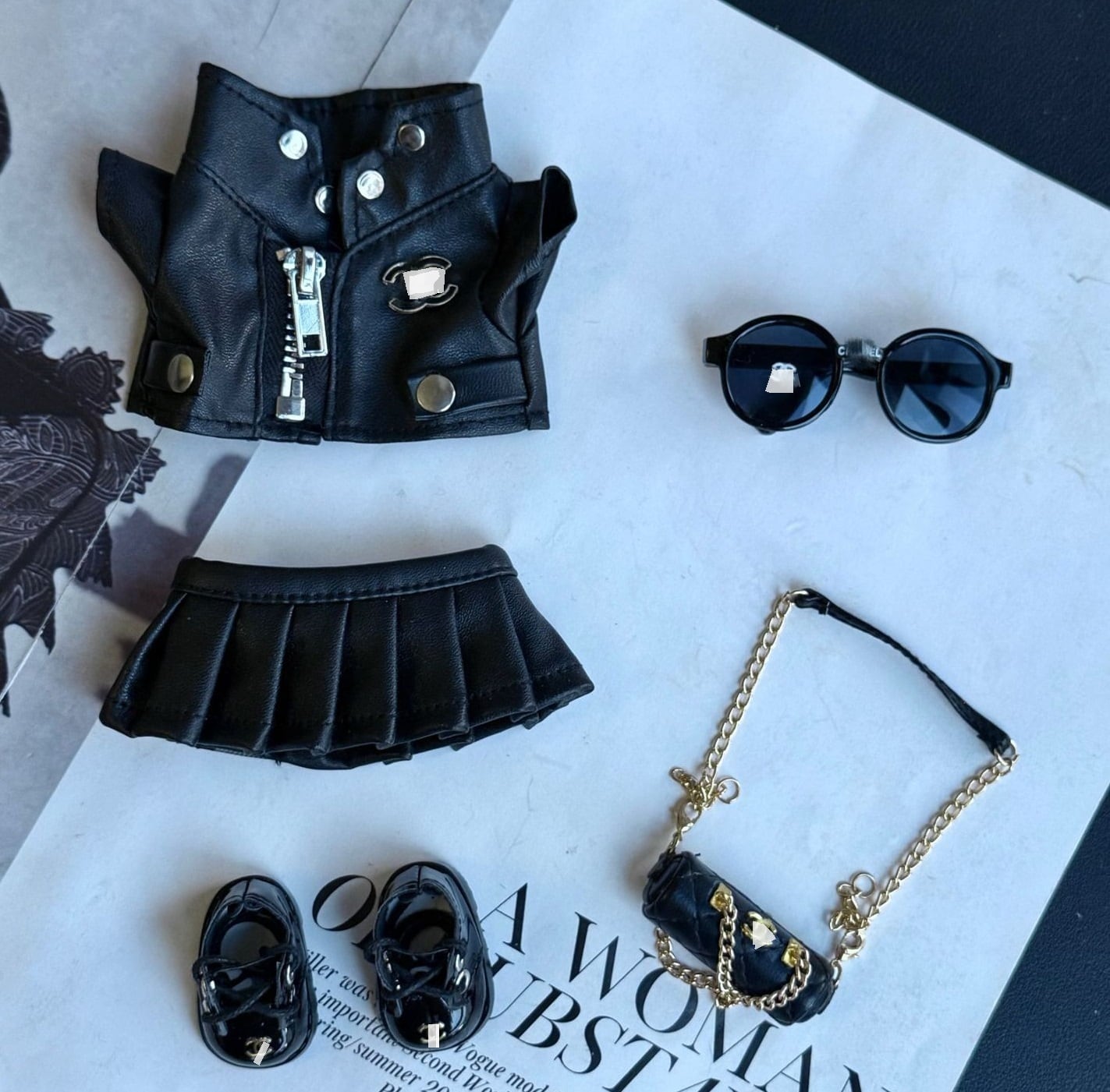 存在感のあるブラックレザー調のジャケットとスカートを中心に、小物までこだわった全5点セットです。
