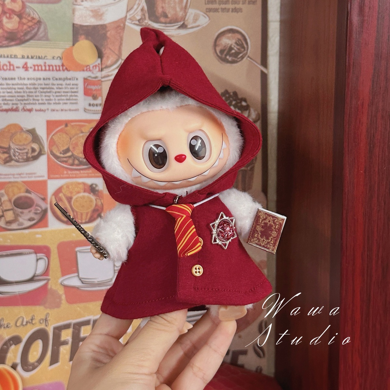 フード付きマント、ネクタイ、手帳、小さな本の4点セット。