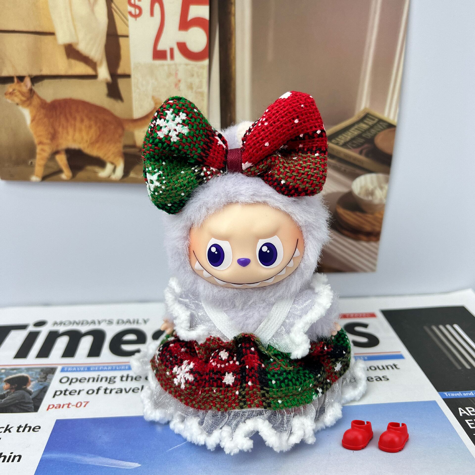 Labubu 1〜4代用 クリスマスパーティー チェックワンピース+ヘアアクセ+シューズ 着せ替え 3点セット