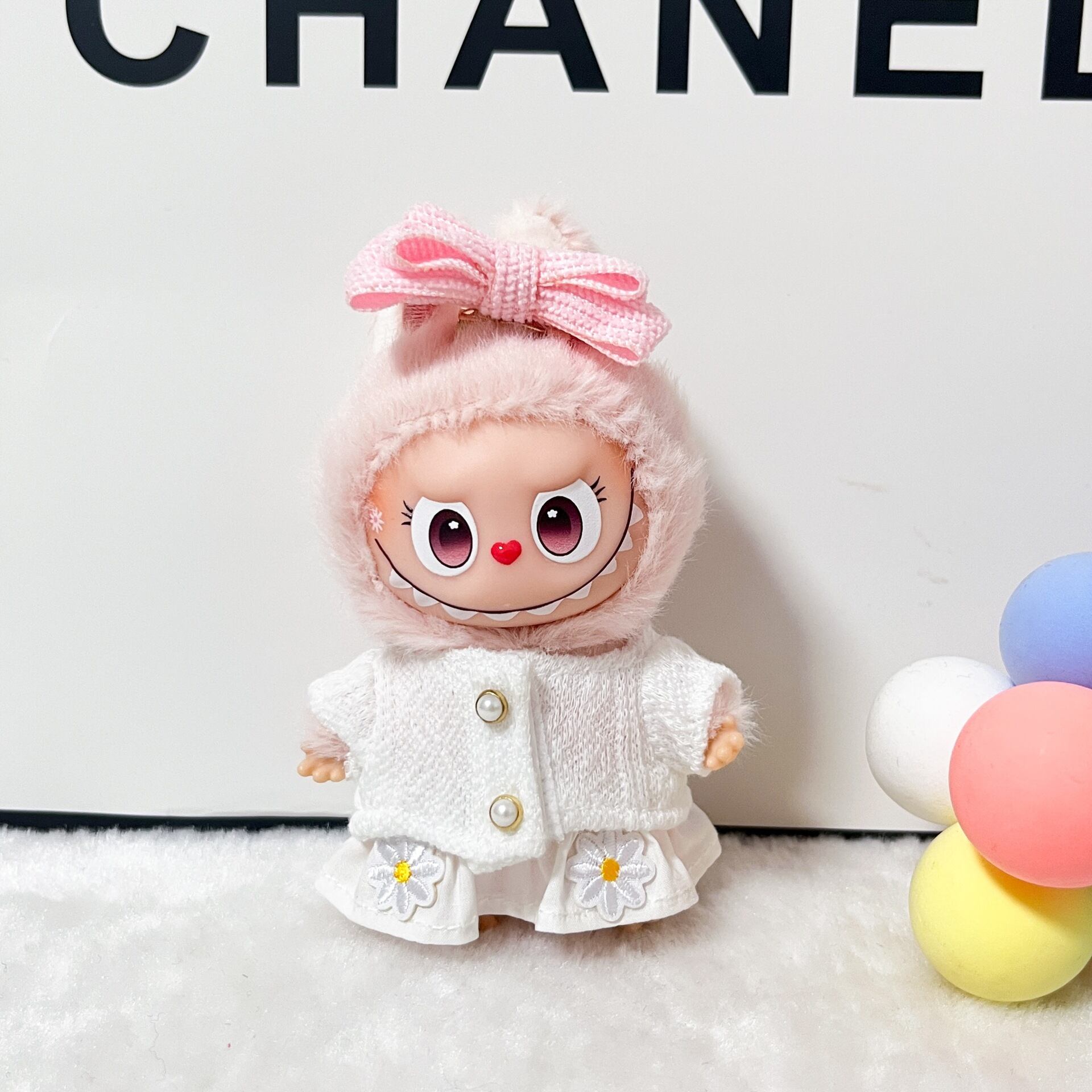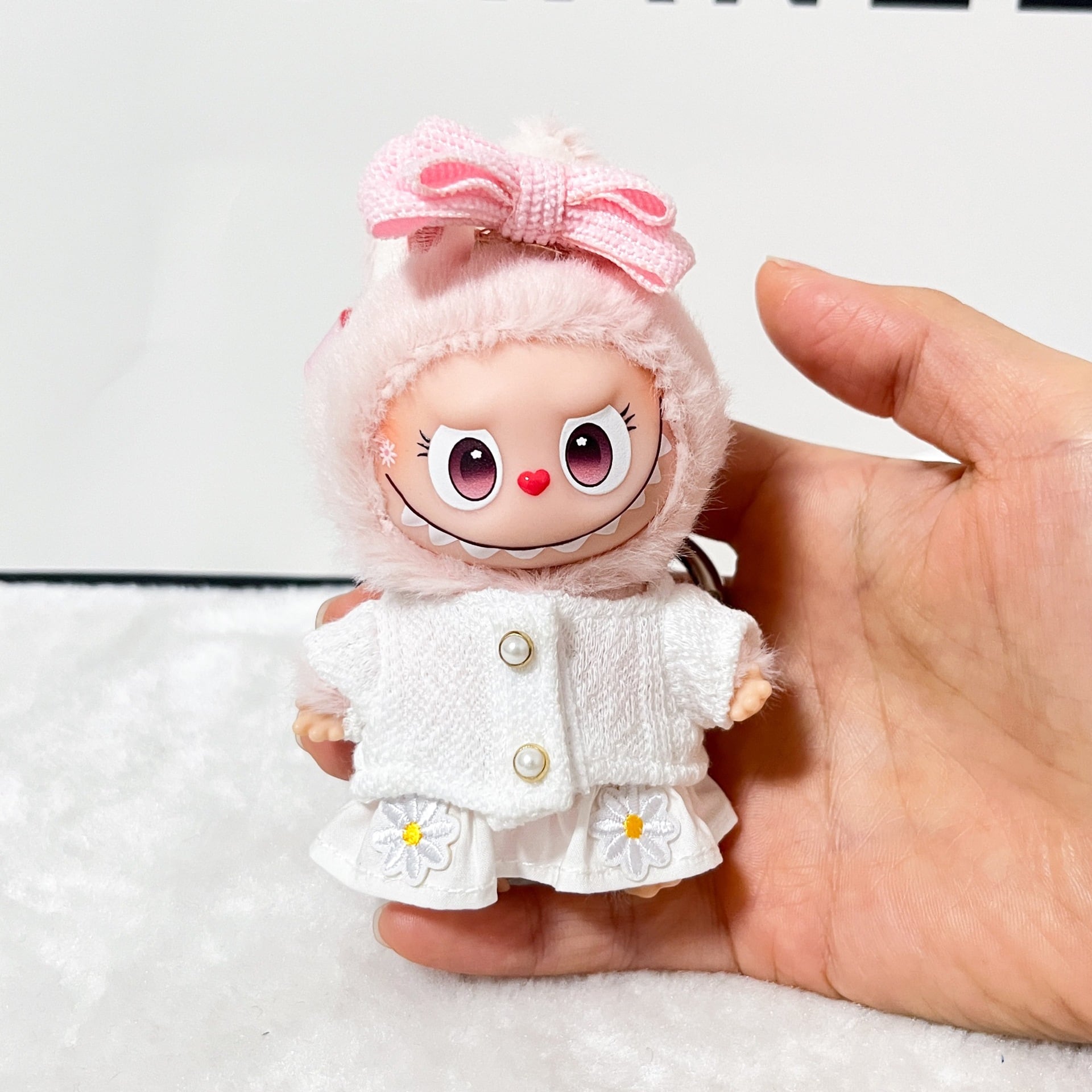 Labubu 4代用 ニットトップス+デイジー飾りスカート ぬいぐるみ 着せ替え 2点セット ホワイト
