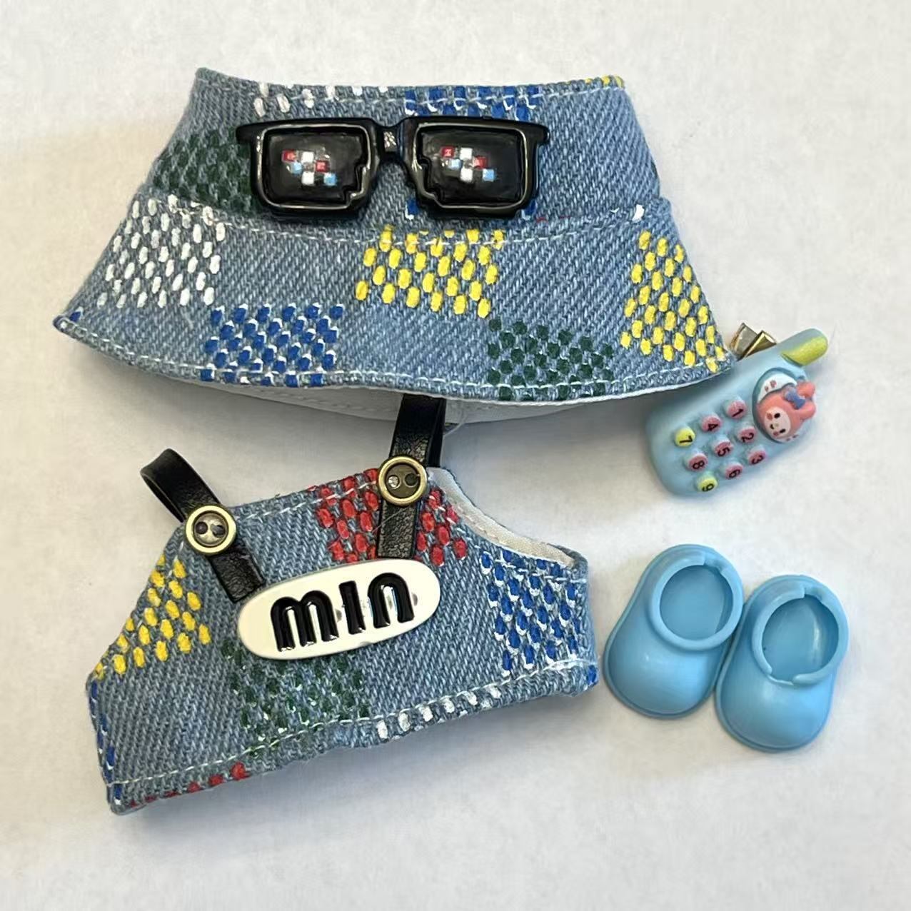 Labubu 4代用 デニムサロペット+帽子+シューズ+チャーム ぬいぐるみ着せ替え 4点セット
