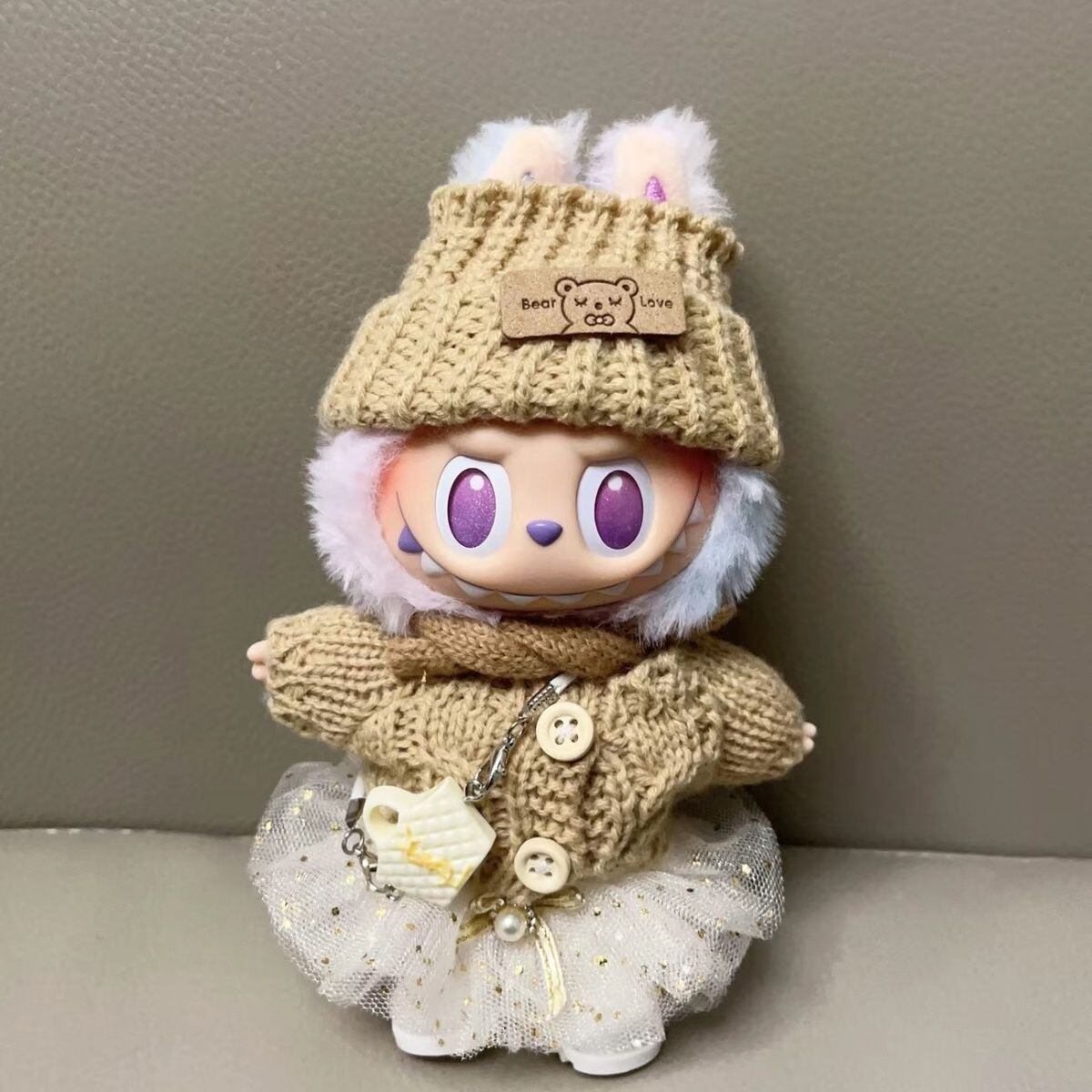 Labubu 1~3代対応 秋冬ニットセーター+チュールスカート+帽子+マフラー+シューズ+ショルダーバッグ 着せ替え 6点セット カーキ