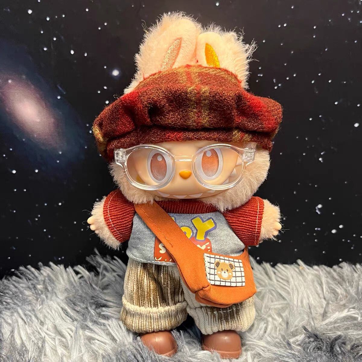 Labubu 1~3代対応 秋冬ヴィンテージトップス+パンツ+ショルダーバッグ+眼鏡+シューズ+ベレー帽 ぬいぐるみ着せ替え 6点セット