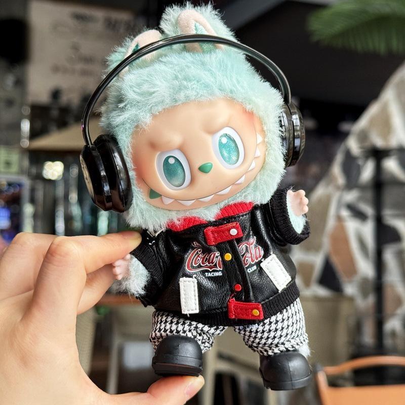 ブラックレザージャケット+チェックパンツ+靴+メガネ+ヘッドホン labubu 1〜3代対応 おしゃれ 着せ替え5点セット
