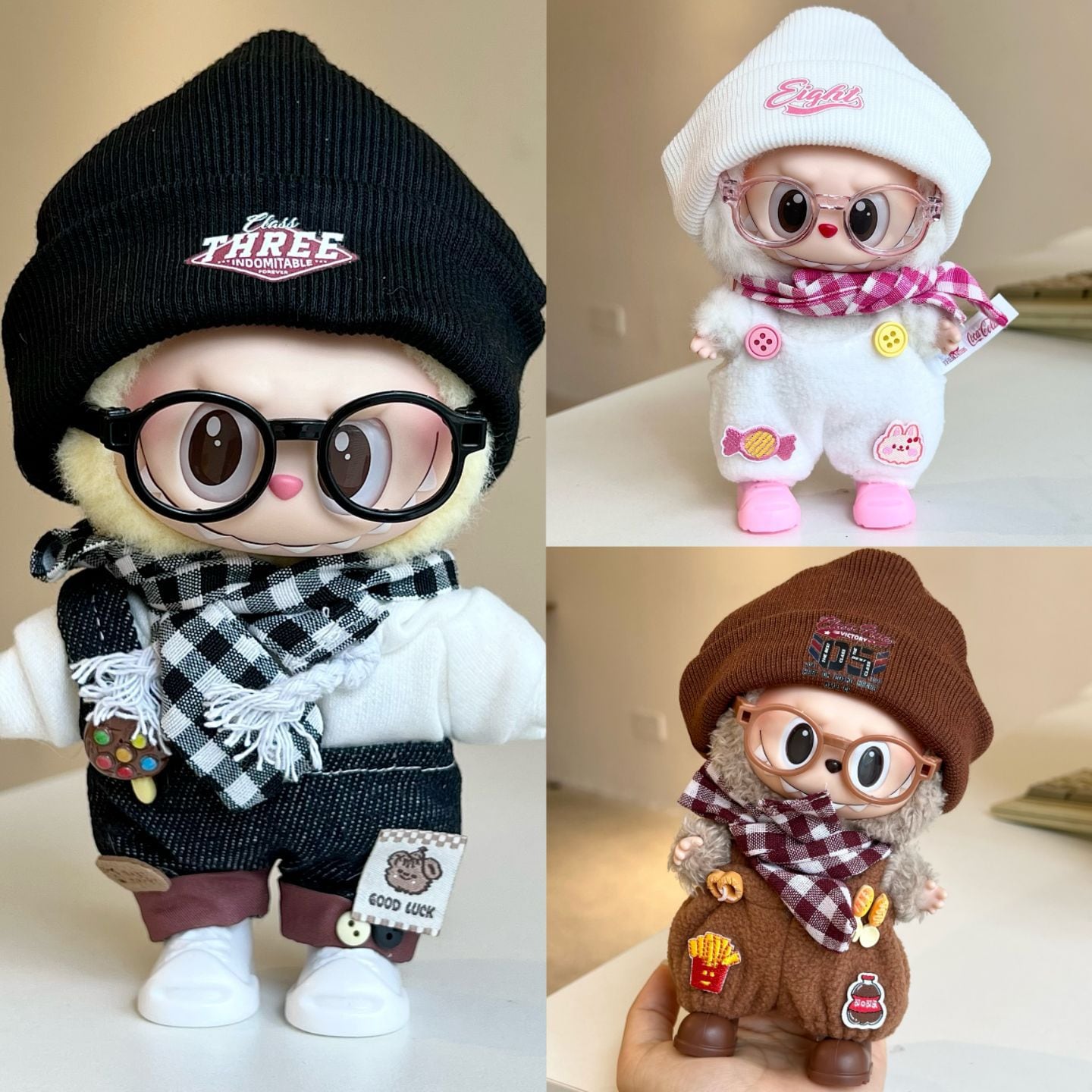 Labubu 1〜3代対応 サロペット+帽子+マフラー+眼鏡+靴 カジュアル ぬいぐるみ着せ替え 6点セット 3色