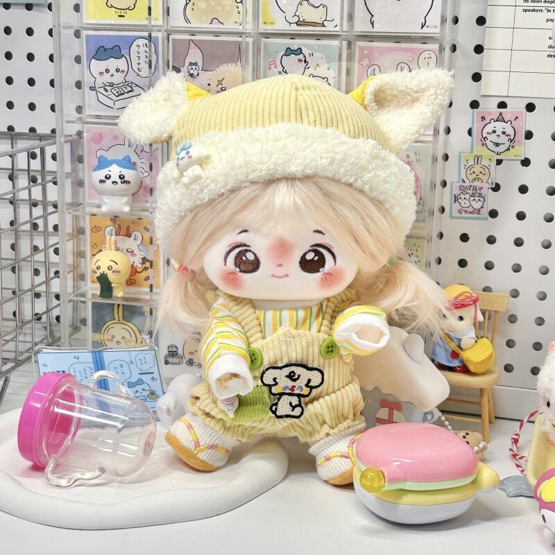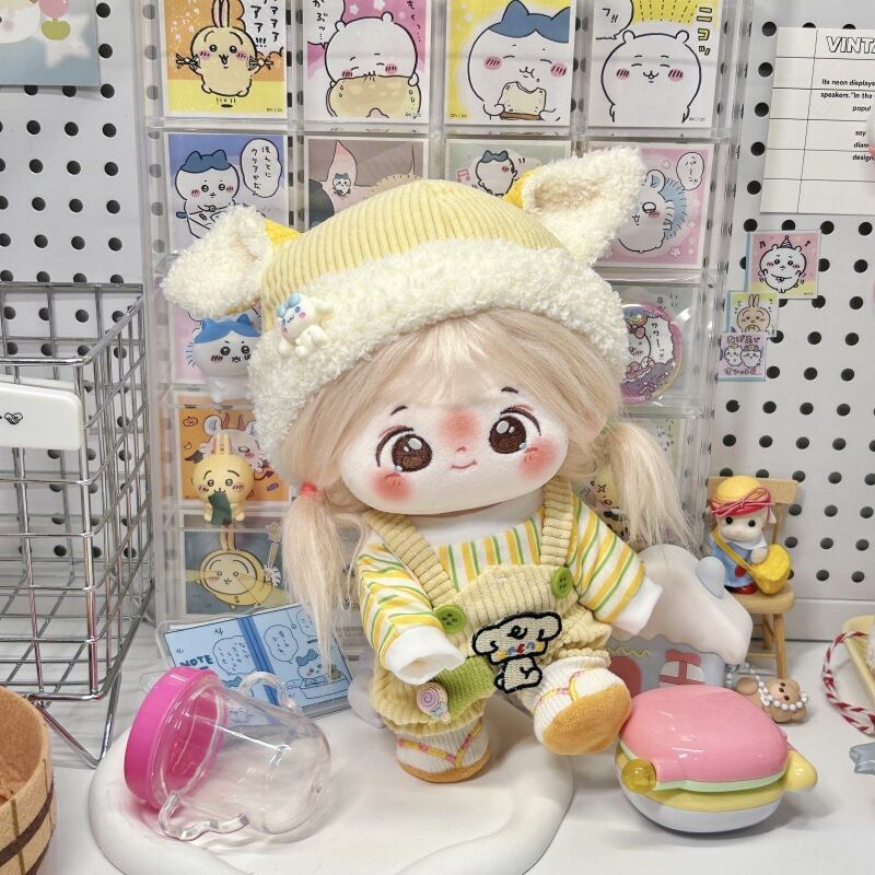 ストライプトップス+サロペット+ふわふわ帽子 17-20cmぬいぐるみ用 可愛い 着せ替え 3点セット レモンイエロー