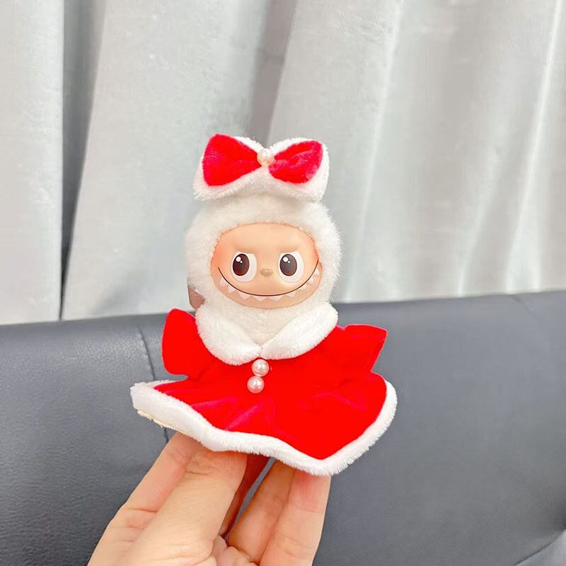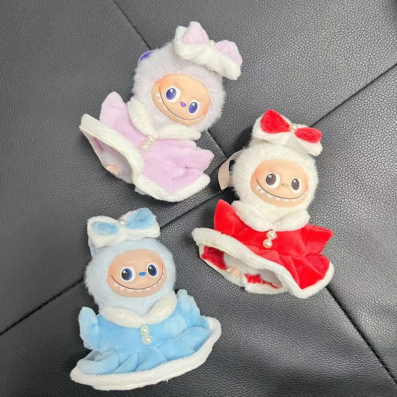 Labubu 4代用 秋冬 もこもこ ワンピース+ヘアアクセ ラブブぬいぐるみ 着替え 2点セット レッド/ブルー/パープル