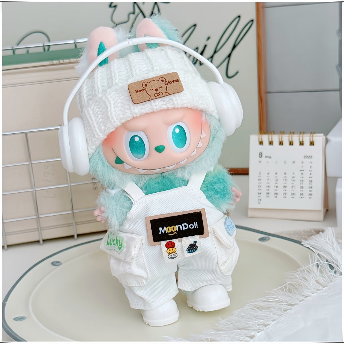 Labubu 123代用 ホワイトオーバーオール+帽子+ヘッドフォン+靴+ミニバッグ ラブブぬいぐるみ カジュアル 着替え用 5点セット