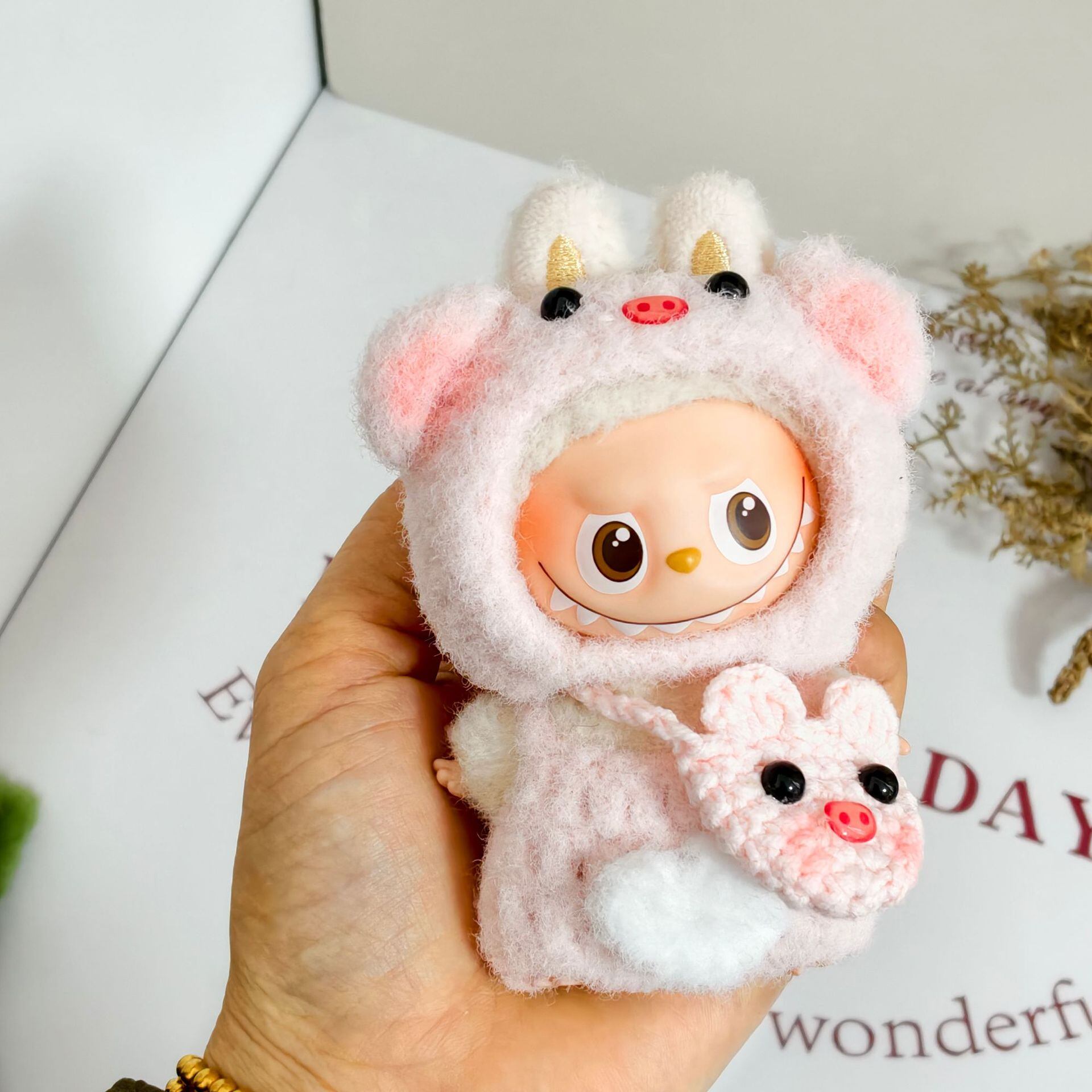 LABUBU 4代用 手編み ピンク小豚 ニットオーバーオール+帽子+ショルダーバッグ ラブブぬいぐるみ 着せ替え アクセサリー 3点セット