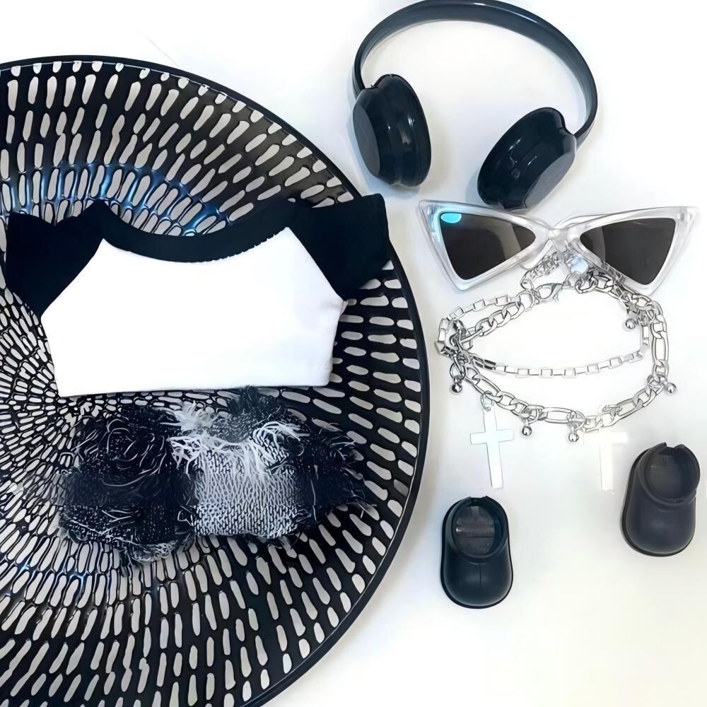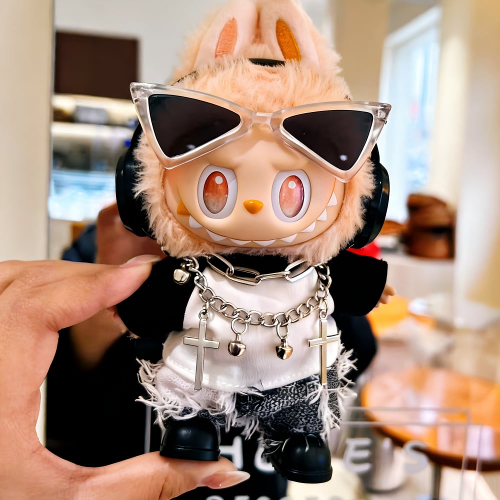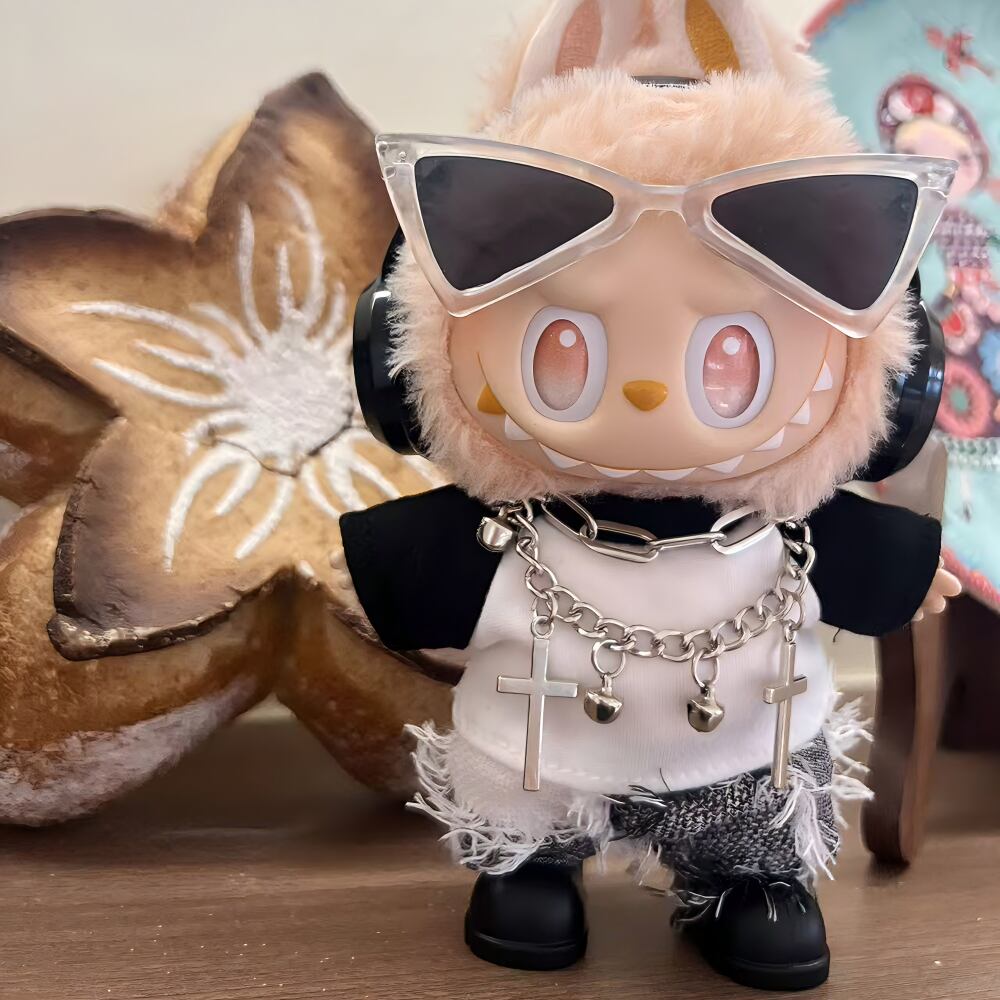 ラブブ 1-3世代対応 Tシャツ+パンツ+ヘッドホン+メガネ+ネックレス+靴 Labubuぬいぐるみ用 着替えブラック 6点セット