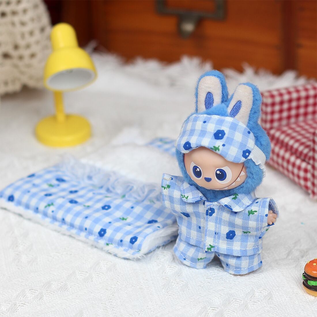 ラブブ 第4世代対応 ブルー チェック×フラワー柄 パジャマ トップス+パンツ+アイマスク Labubuぬいぐるみ用 着替え 3点セット