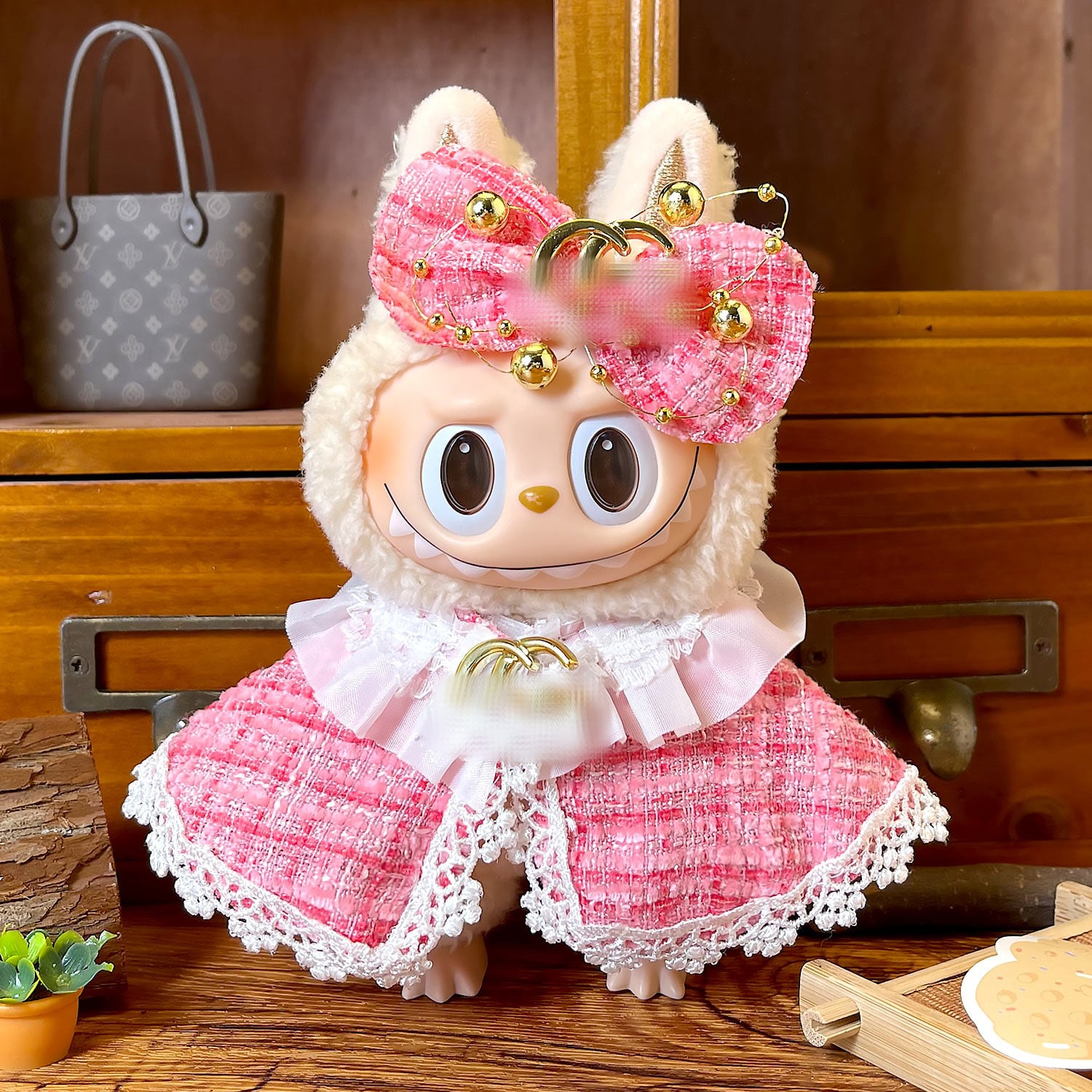ケープとおそろいの色・素材を使用したヘアアクセサリー付き。