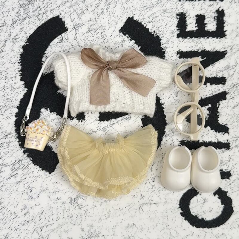 labubu 1-3世代対応 リボンニットセーター+チュールスカート+靴+メガネ+チャーム ラブブぬいぐるみ用 カジュアル 秋冬コーデ 5点セット
