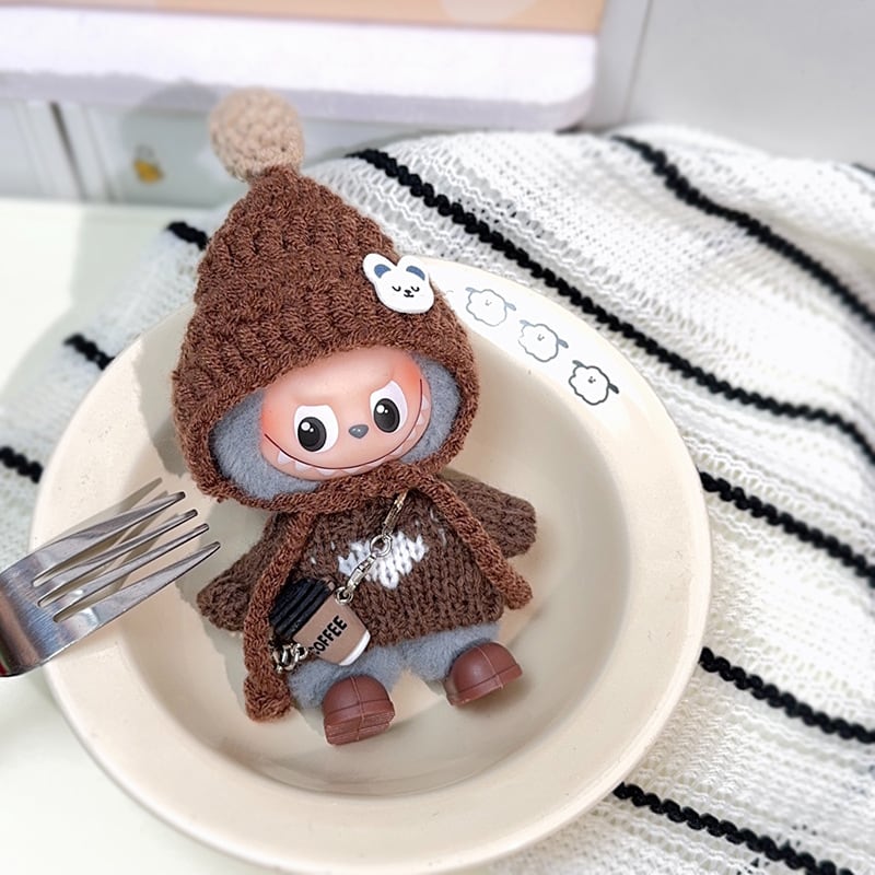 ラブブ 4代対応 秋冬ニットコーデ セーター+ニット帽+靴+チャーム Labubuぬいぐるみ用 着せ替え 4点セット ブラウン