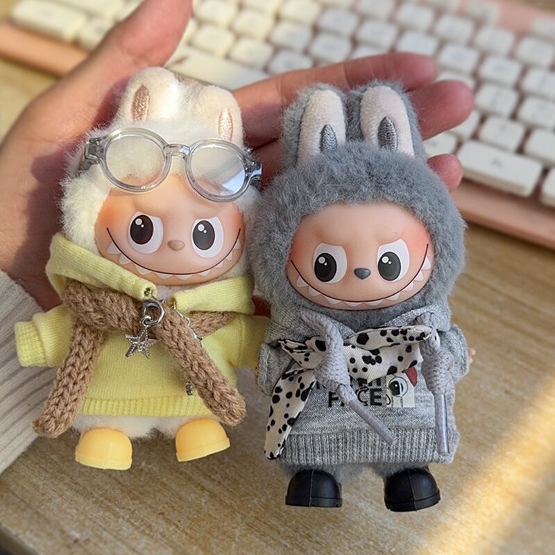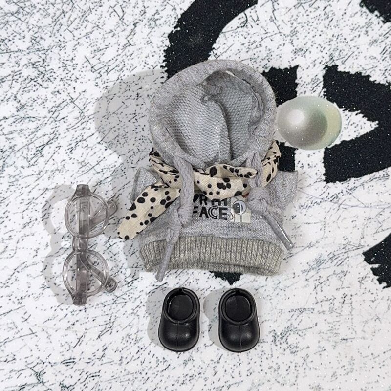 ラブブ 4代対応 秋冬カジュアル パーカー+マフラー+メガネ+靴 Labubuぬいぐるみ用 着せ替え 4点セット イエロー/グレー