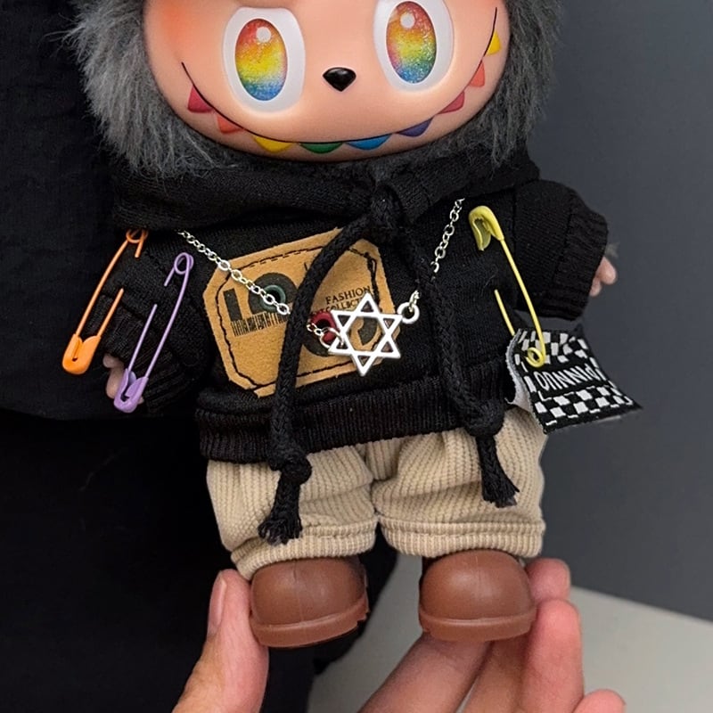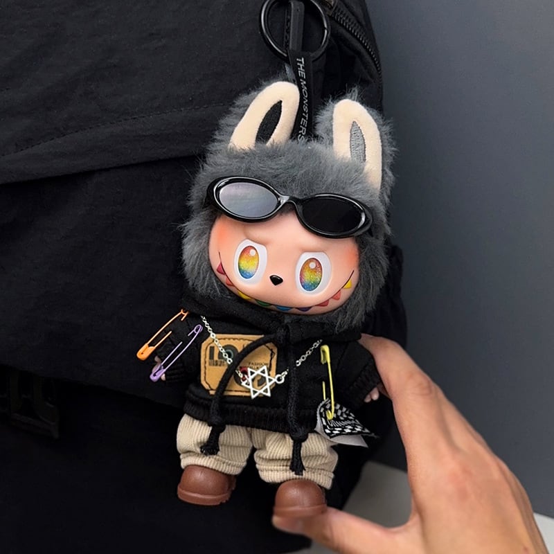 ラブブ 1-3代対応 おしゃれ フード付きパーカー+パンツ+ネックレス+メガネ+靴 Labubuぬいぐるみ用 ぬい服 着せ替え 5点セット