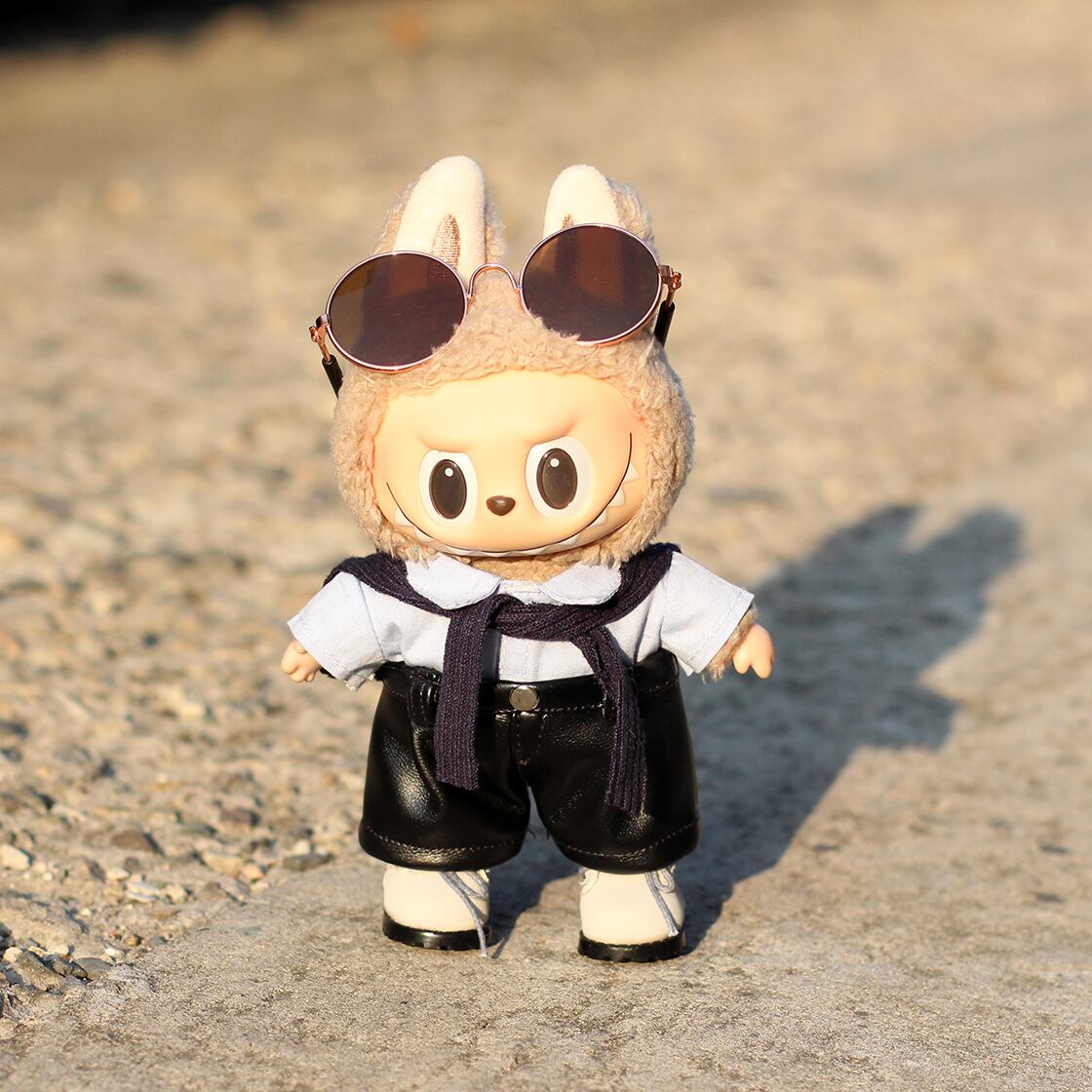 ラブブ 1-3代対応 カジュアル ブルーシャツ+ニットショール+レザーパンツ Labubu ぬい服 着せ替え 3点セット