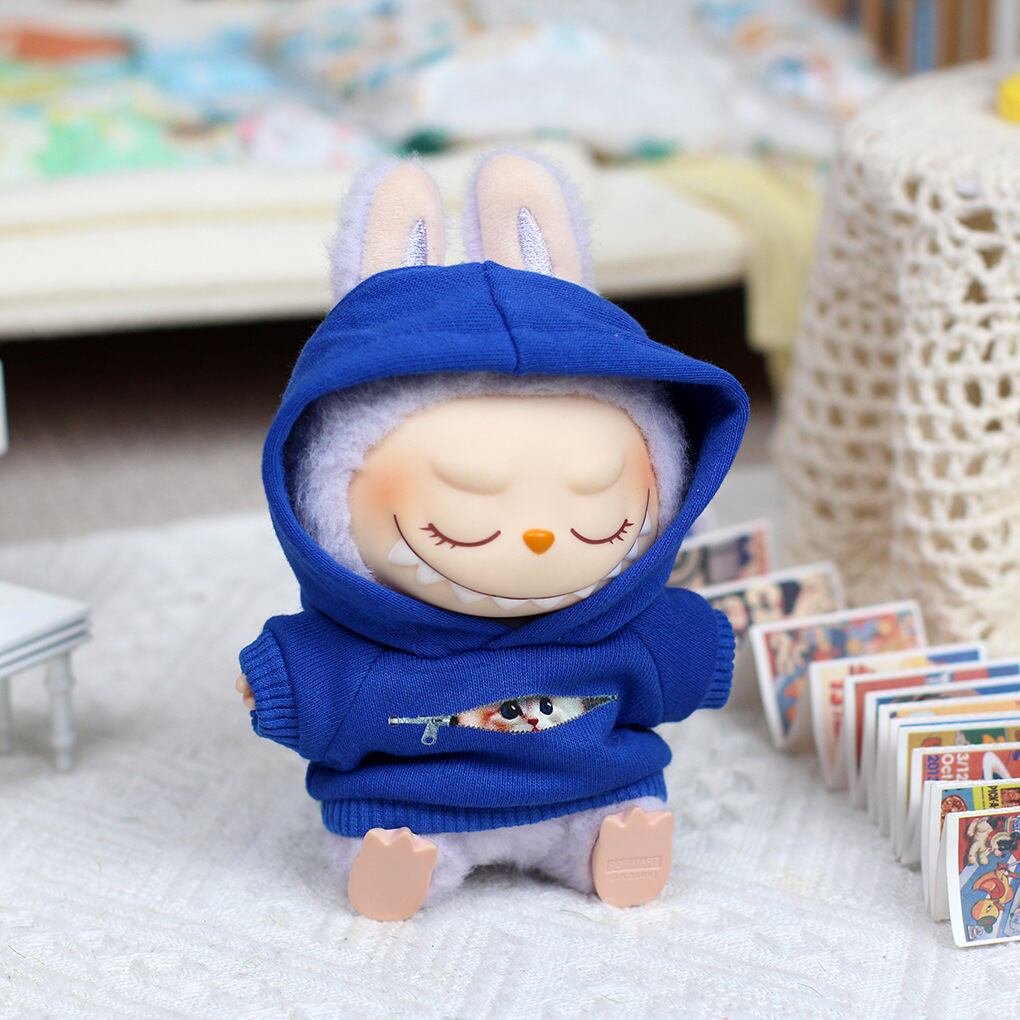 Labubu 1-3代対応 ネコ柄 ニットフード付きパーカー+デニムパンツ ラブブ ぬいぐるみ フーディー 着せ替え 2点セット
