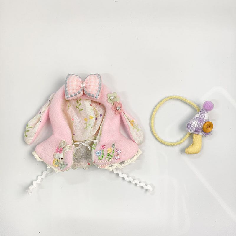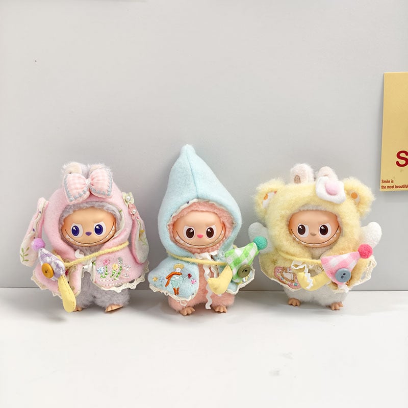 ラブブ 4代対応 刺繍入り フード付き マント+傘型チャーム Labubu ぬいぐるみ用 ケープ 着せ替え 2点セット イエロー/ピンク/ブルー