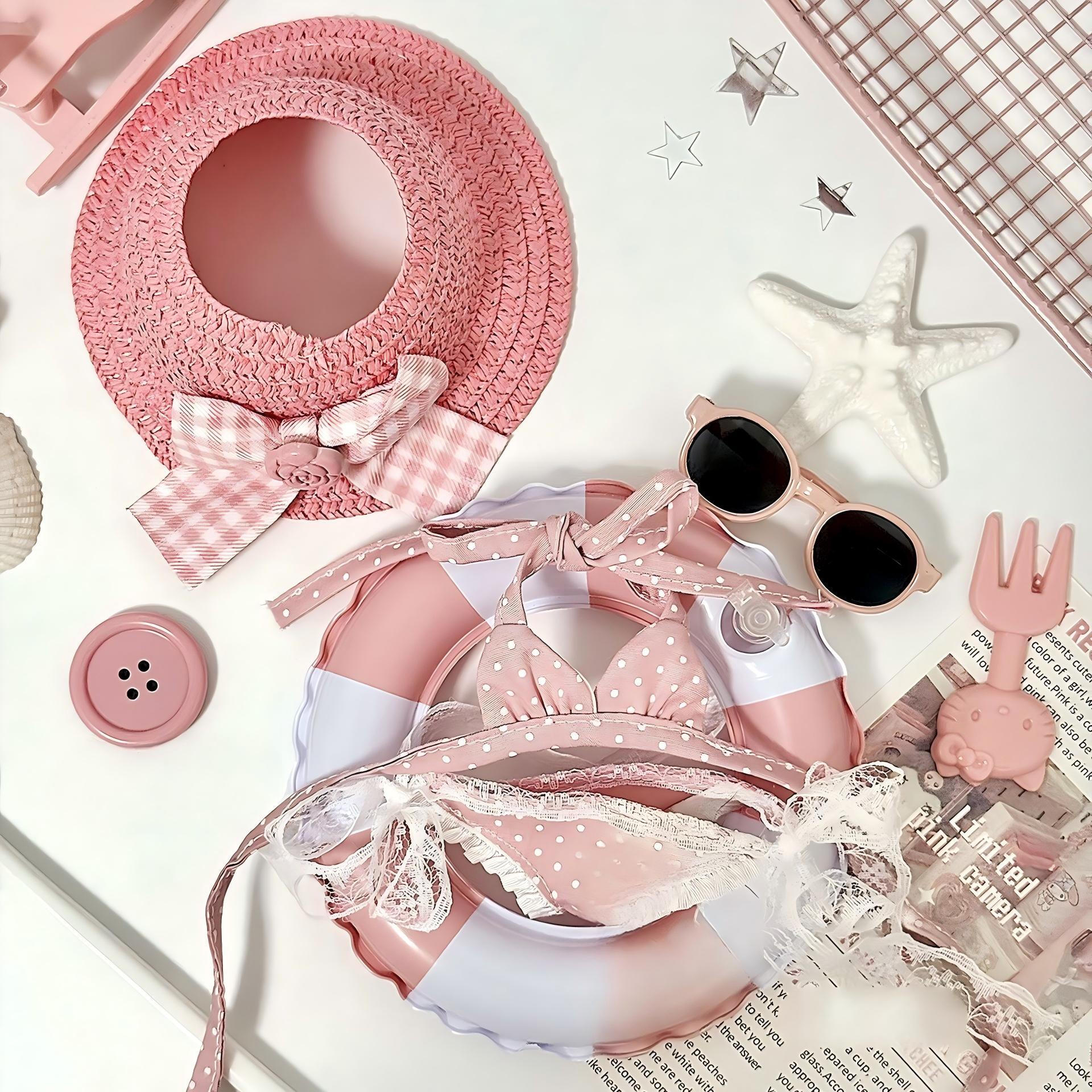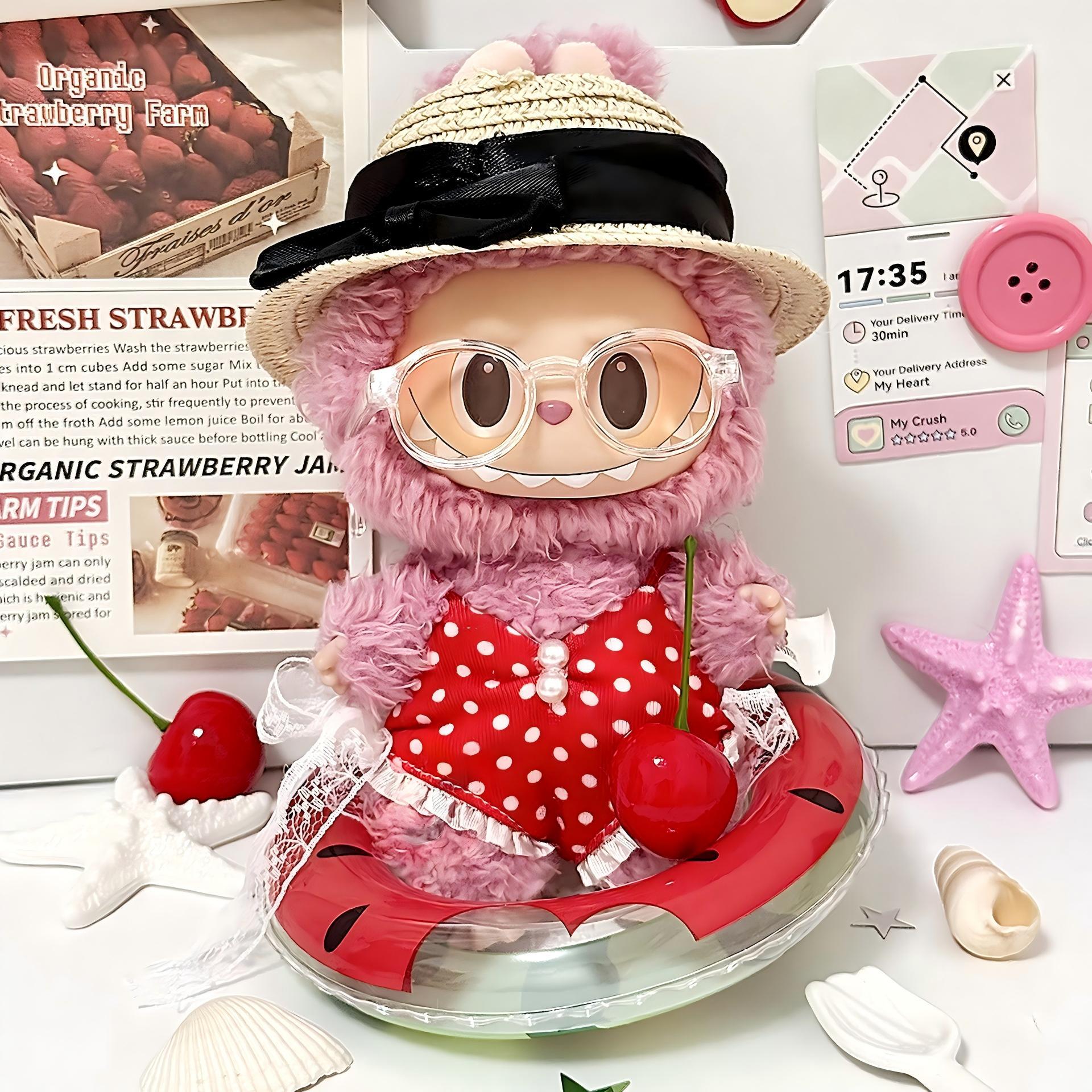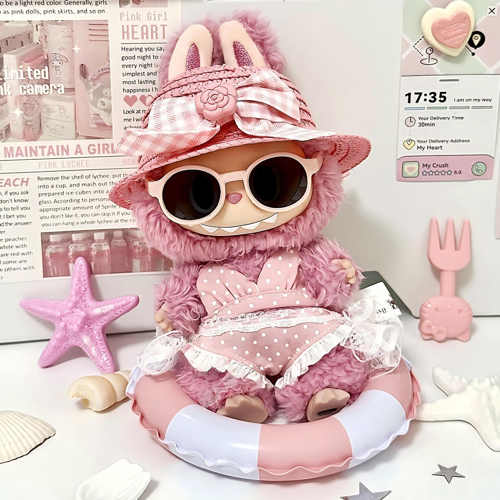 Labubu 1-3代対応 サマースイム ドット柄水着+帽子+浮き輪+サングラス ラブブ ぬいぐるみ 着せ替え 4点セット 4色