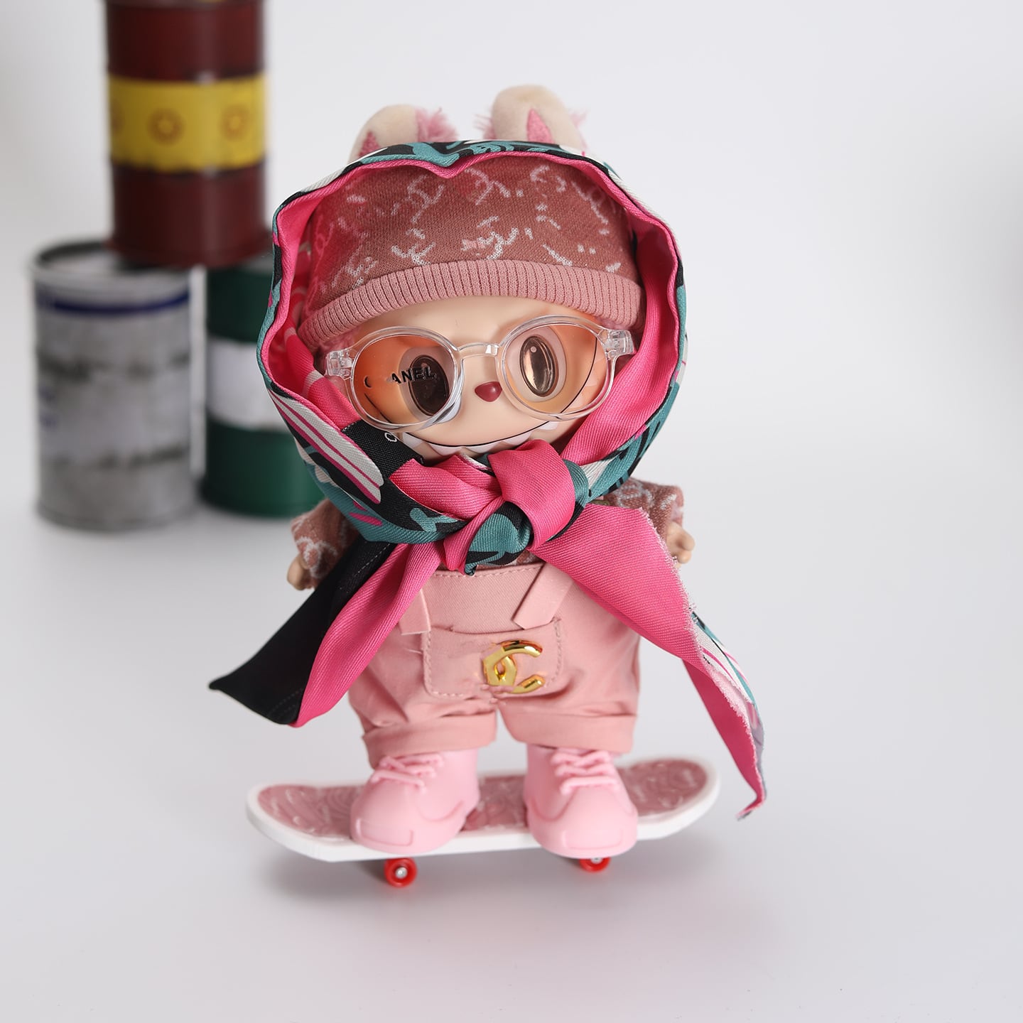 ラブブ 1-3代対応 トップス+サロペット+帽子+バンダナ+メガネ+シューズ+スケボー Labubu ぬいぐるみ 着せ替え 7点セット ピンク