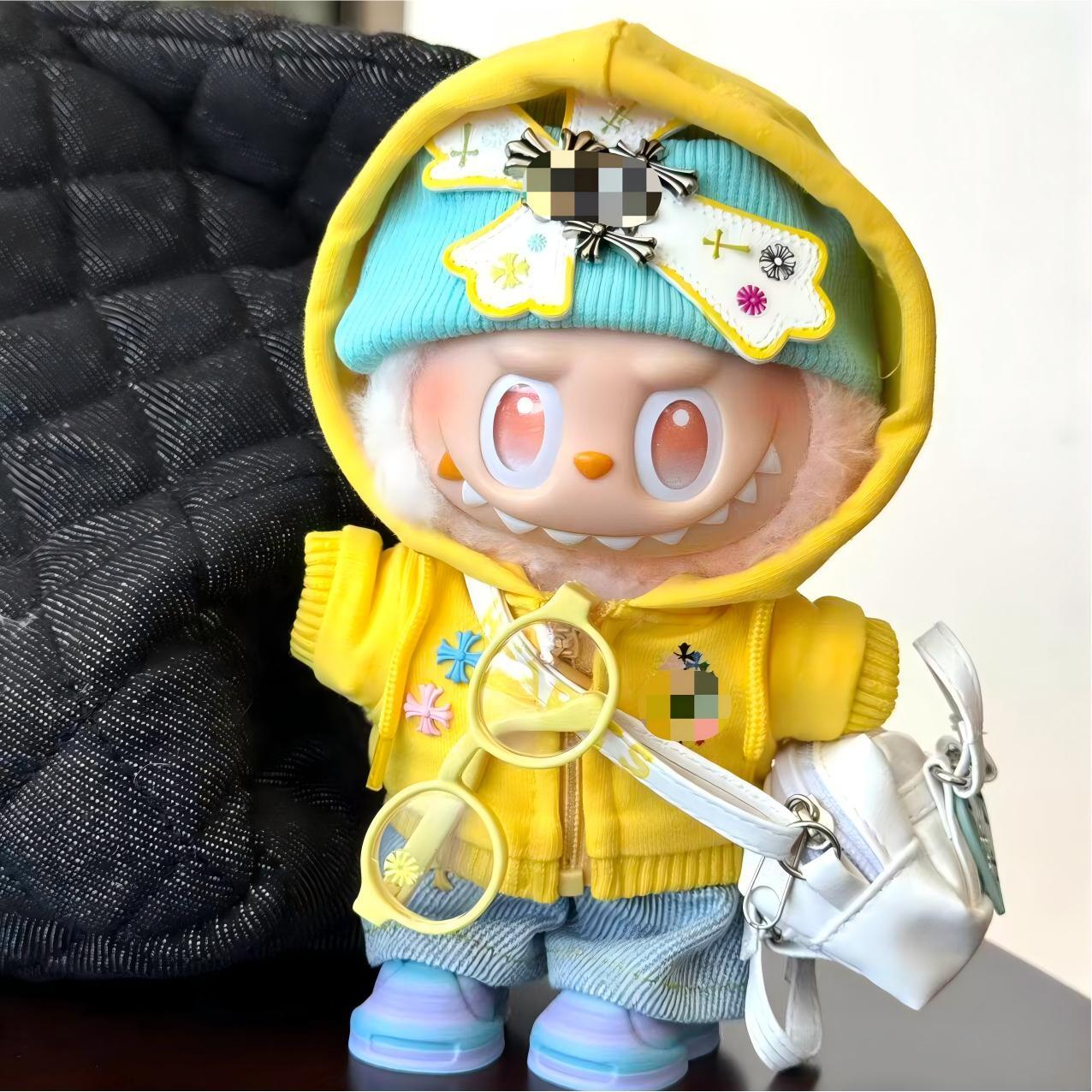 ラブブ 1-3代対応 パーカー+パンツ+帽子+靴+バッグ+メガネ Labubu ぬいぐるみ 着せ替え 6点セット イエロー