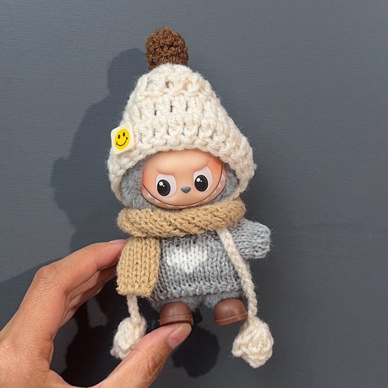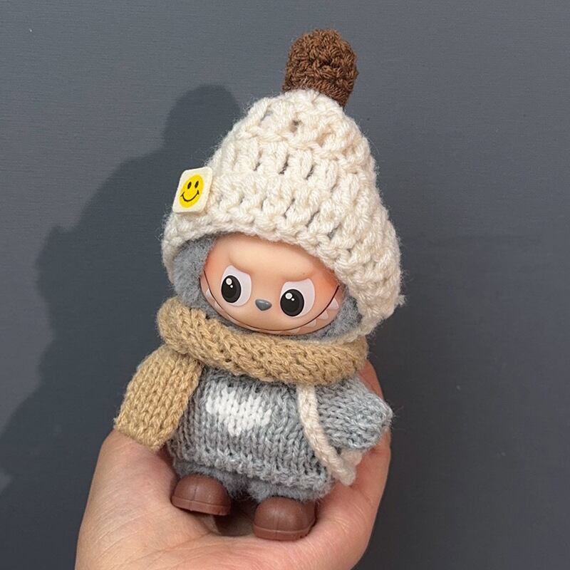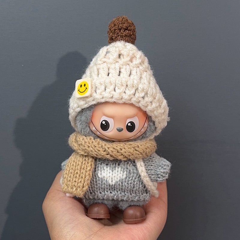 ラブブ 4代用 カジュアル グレーニットセーター+ブラウンマフラー+ベージュニット帽+靴 Labubu ぬいぐるみ 着せ替え 4点セット