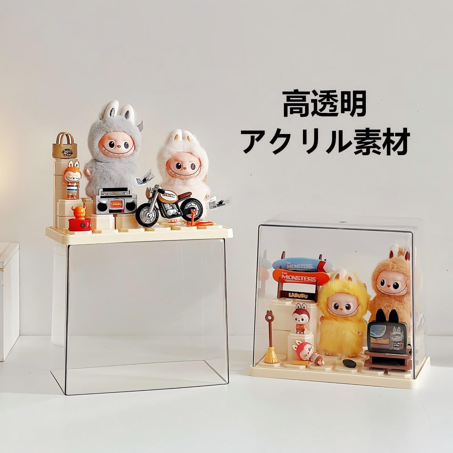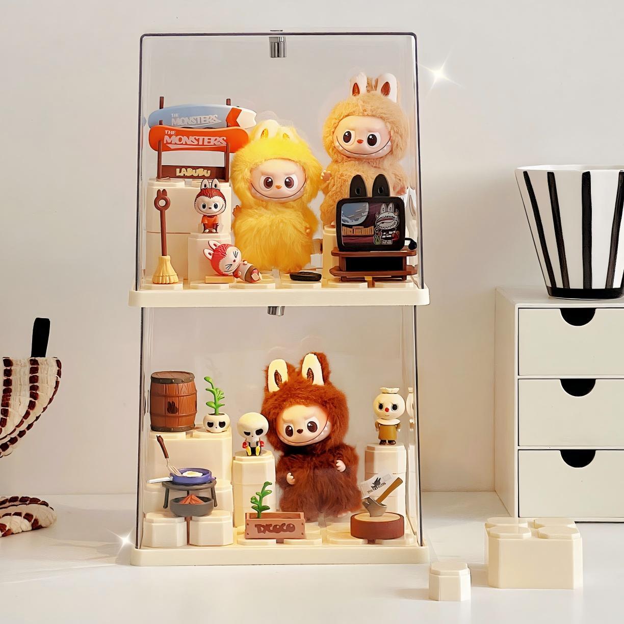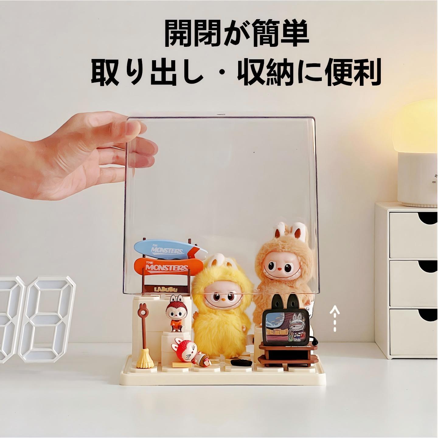 LABUBU 4世代/10cmぬいぐるみ対応 アクリル ディスプレイケース 階段3段&台座14個付き 収納ボックス 19×17×12cm イエロー/ホワイト