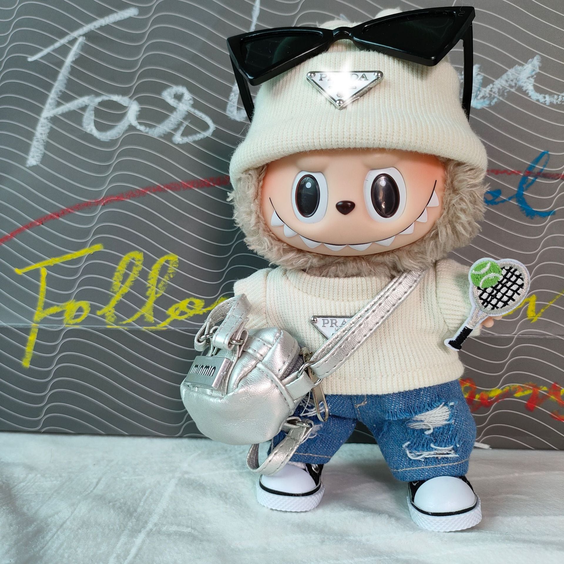 ラブブ 1-3世代対応 カジュアル ホワイトニットTシャツ+デニムパンツ+帽子+シルバーバッグ LABUBU ぬいぐるみ用 着せ替え服 4点セット