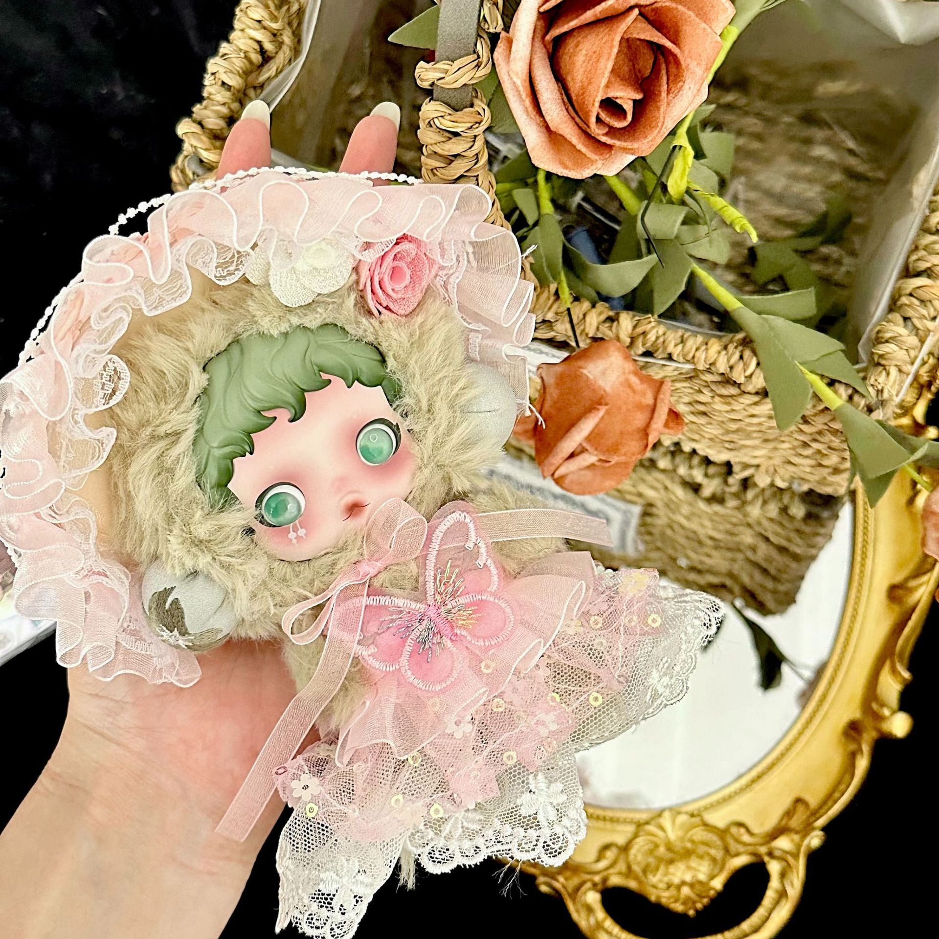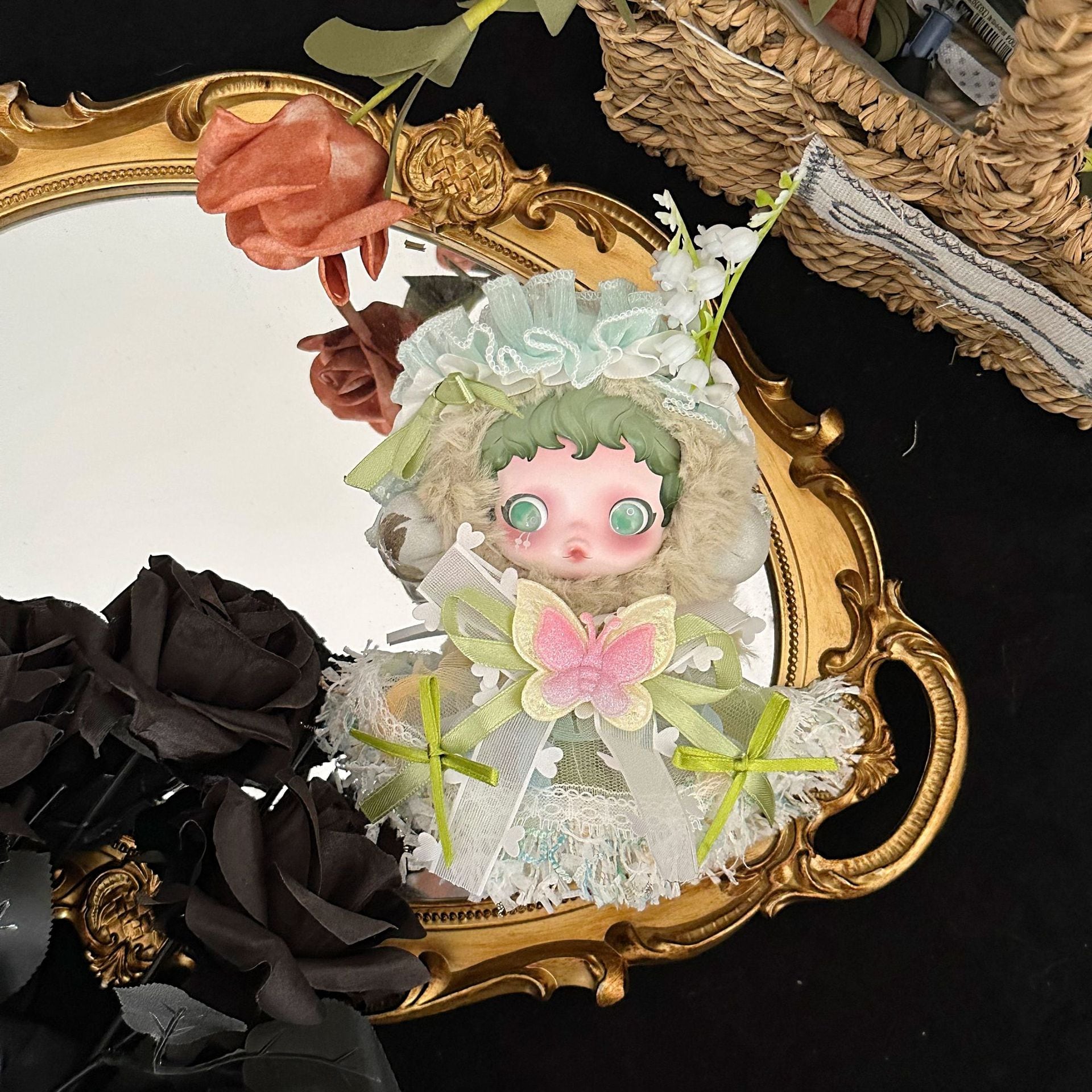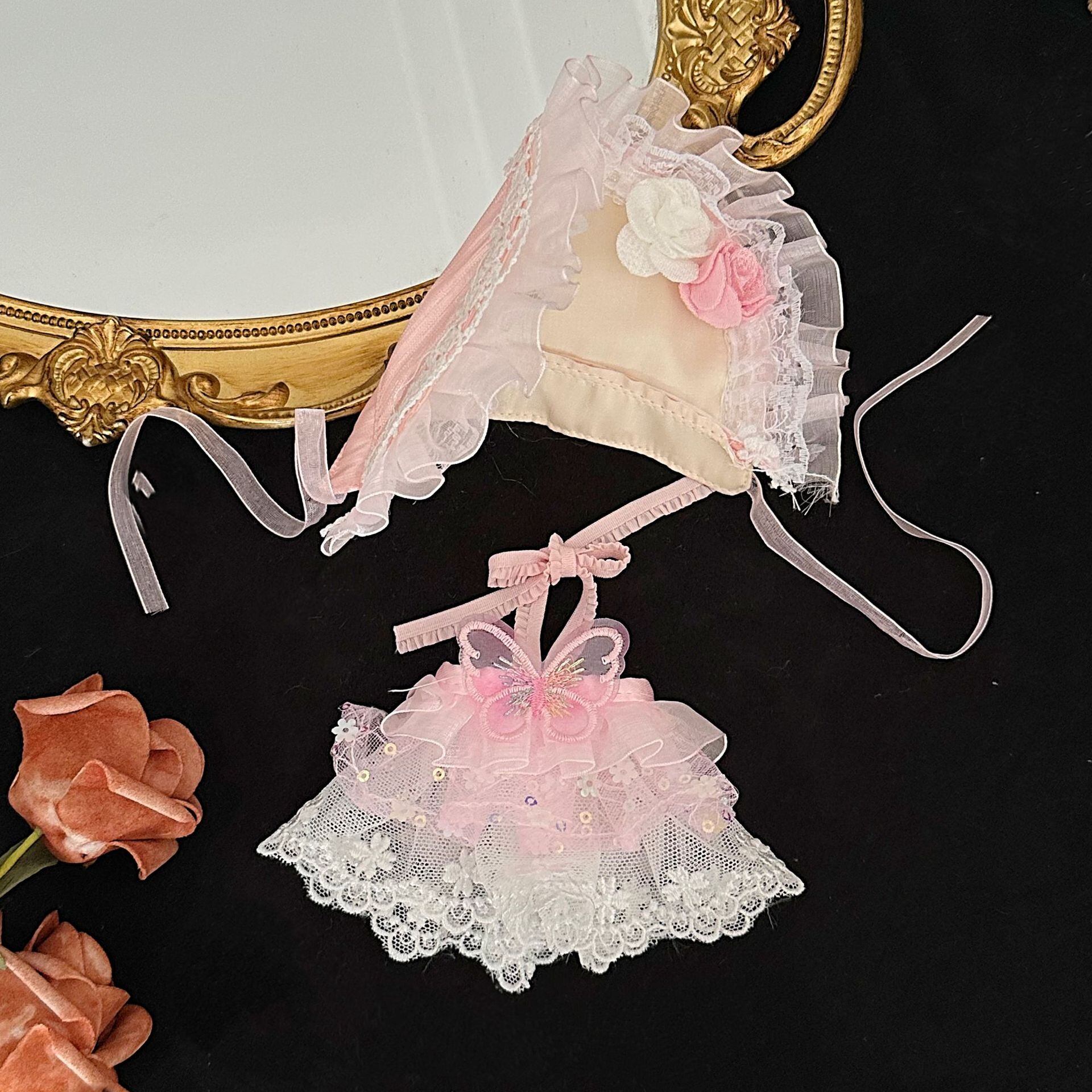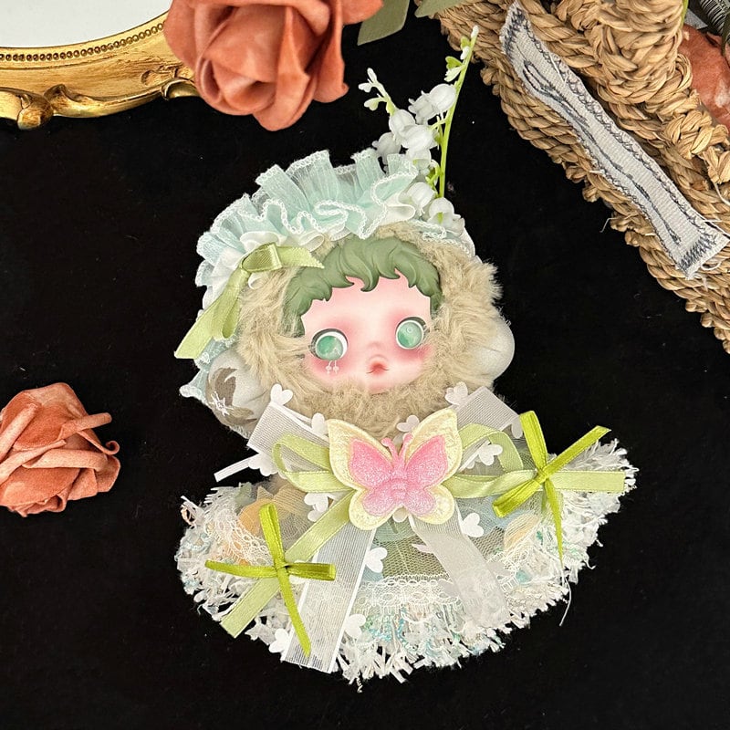 SPぬいぐるみ用 花の妖精 蝶の飾り レースワンピース+お花ヘアアクセサリー 着せ替え衣装 ドレス 2点セット 鈴蘭グリーン/バラピンク