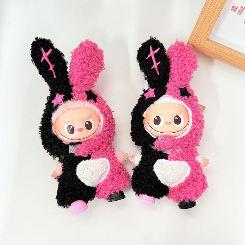 LABUBU 4世代対応 もこもこ ラビット ロンパース+耳付き帽子+靴 ラブブ ぬいぐるみ用 着せ替え服 3点セット ピンク×ブラック