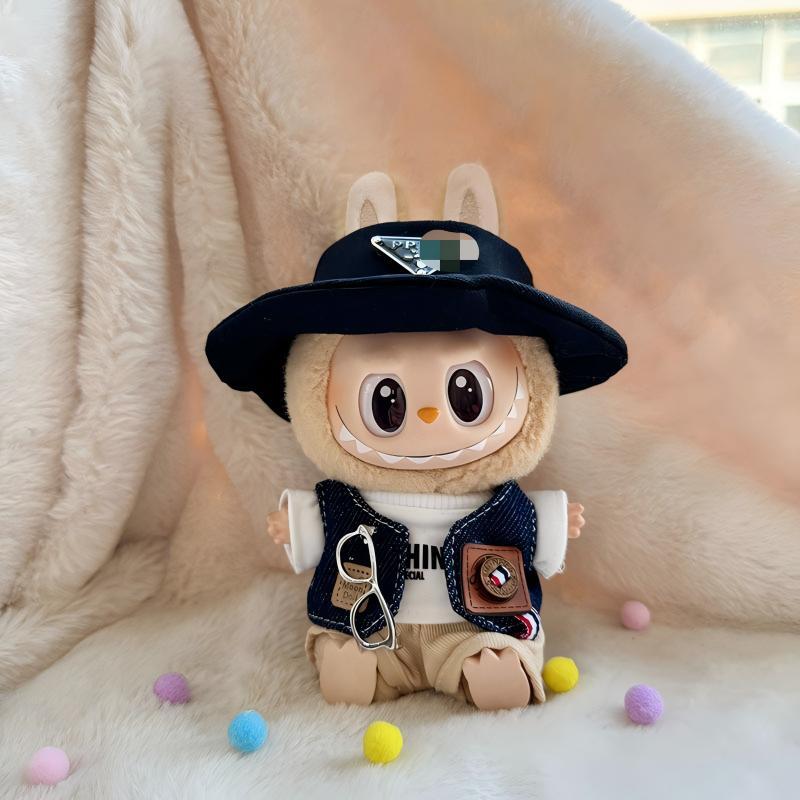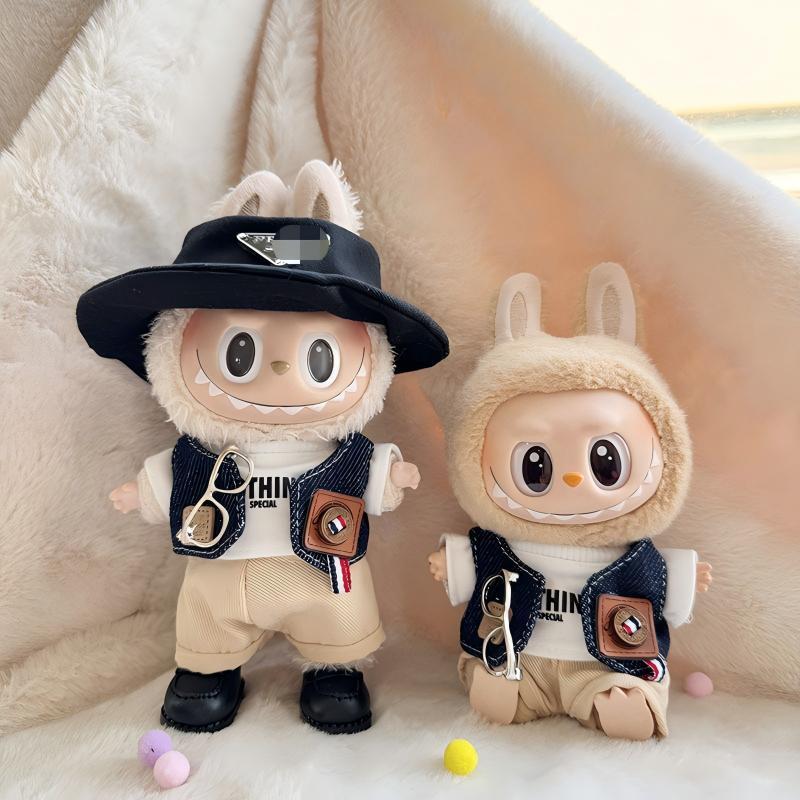 Labubu 1-3代用 カジュアル Tシャツ+デニムベスト+パンツ+帽子 ラブブ ぬいぐるみ お着替え 4点セット