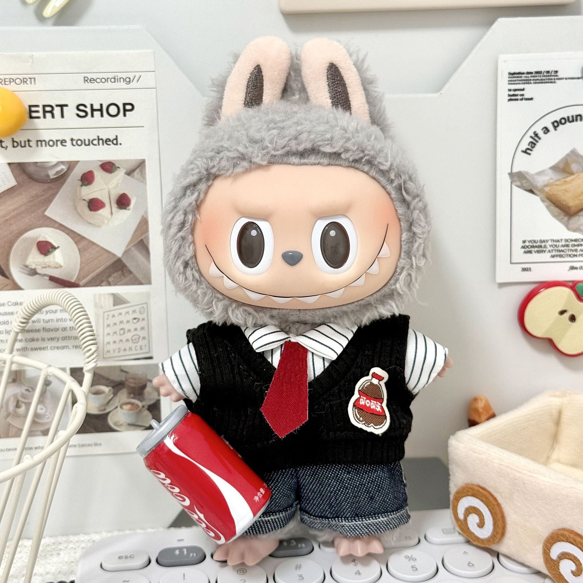 Labubu 1-3代用 おしゃれ ストライプシャツ+ベスト+パンツ ラブブ ぬいぐるみ カジュアル 着せ替え 3点セット