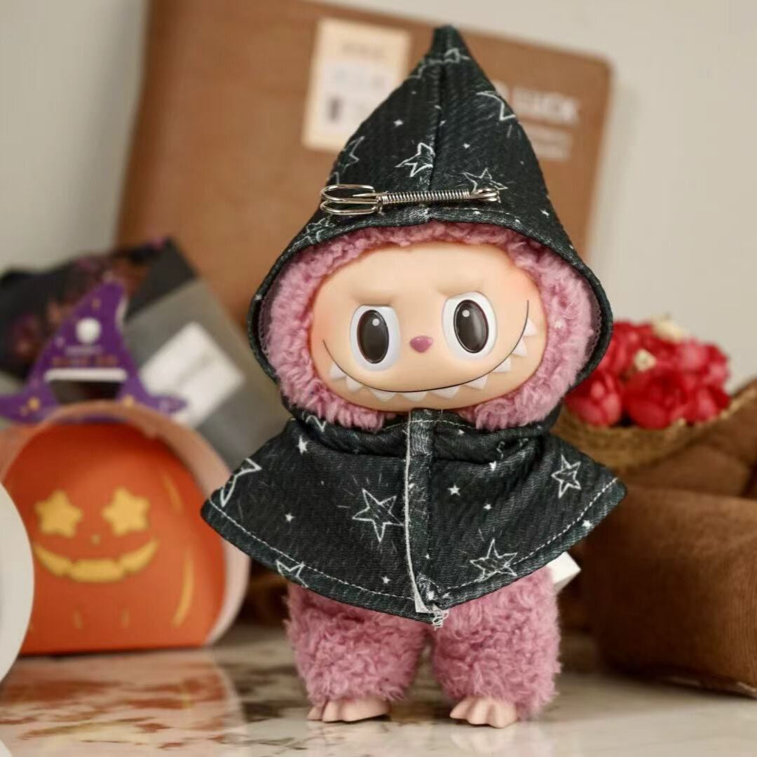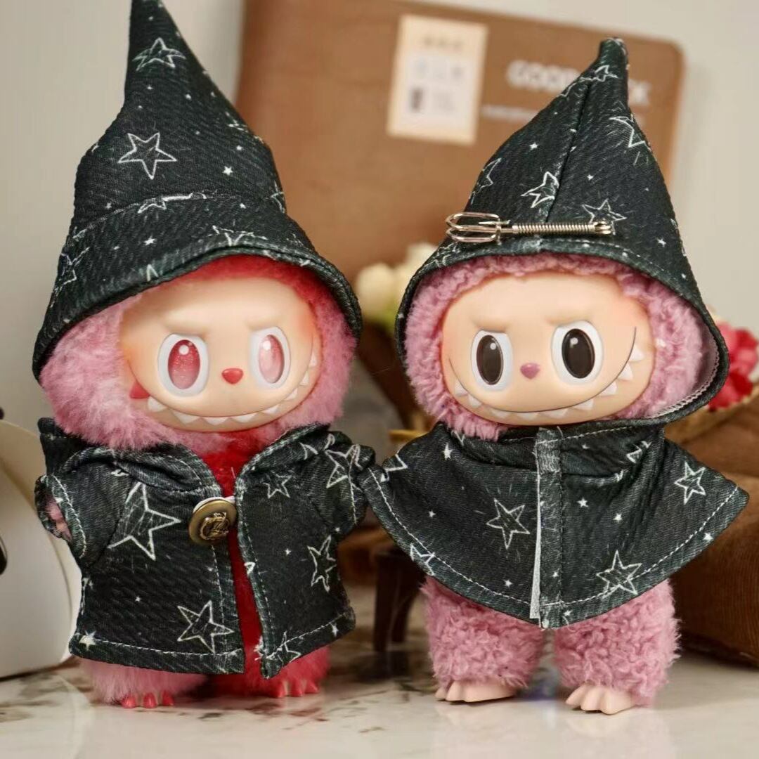 Labubu 1-3代用 ダークウィザード 星柄 マント/ショール+帽子 ラブブ ぬいぐるみ 着せ替え 服 2点セット ブラック