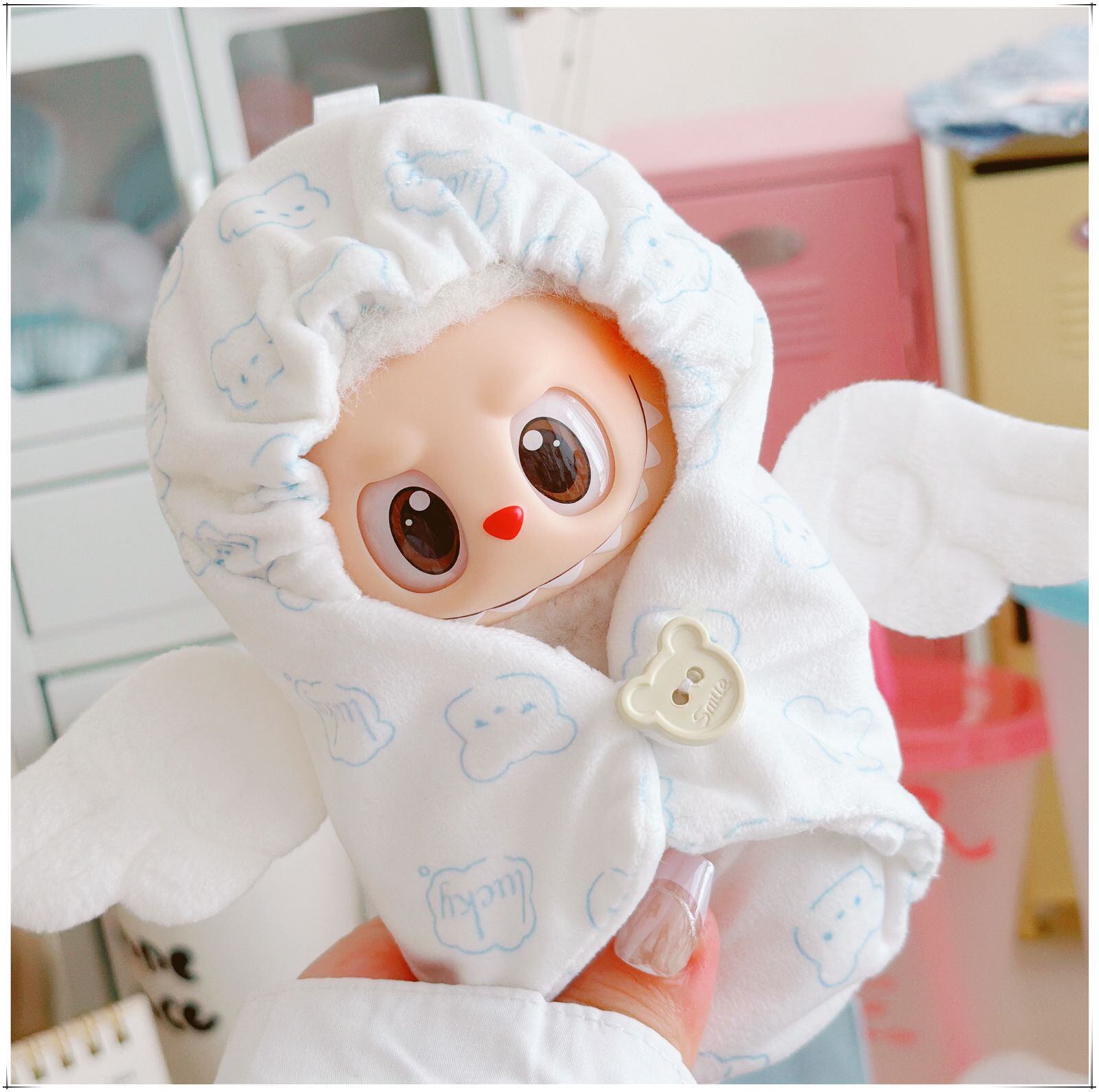 Labubu 1-3代用 かわいい パジャマ 天使の羽付き オールインワン ラブブぬいぐるみ ルームウェア 着せ替え 服 ブルー/ピンク
