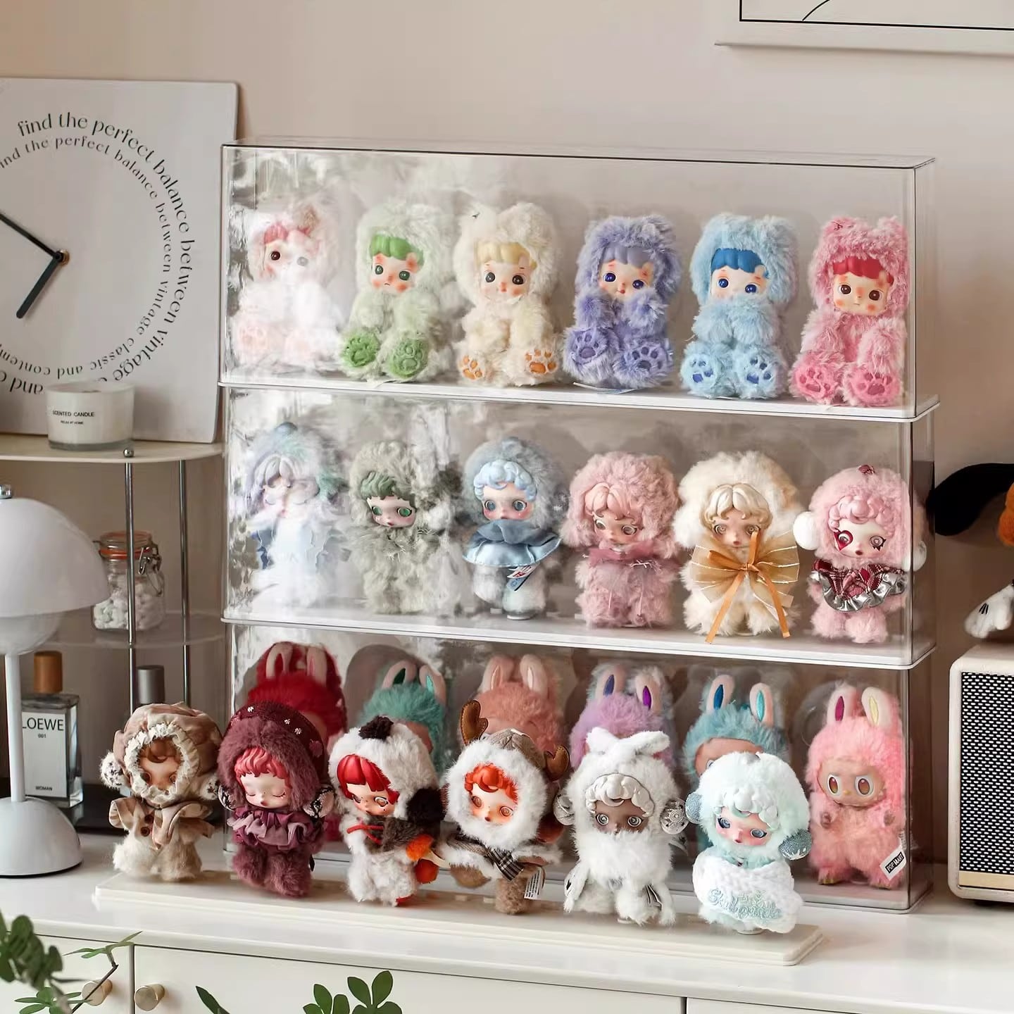 LABUBU1-3代/Dimoo/Skullpanda用 ディスプレイケース 透明 アクリル 6体収納 固定スタンド付き ぬいぐるみ 収納ボックス 57×19.5×9cm