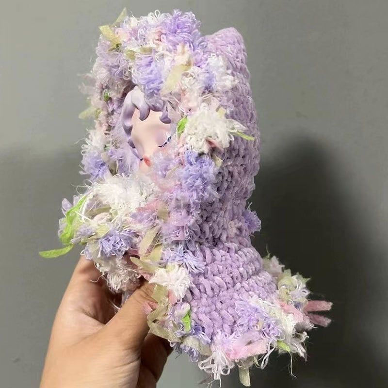 Skullpanda用 エレガント フラワー装飾 ニット フード付き ケープ スカルパンダ ぬいぐるみ 着せ替え マント パープル