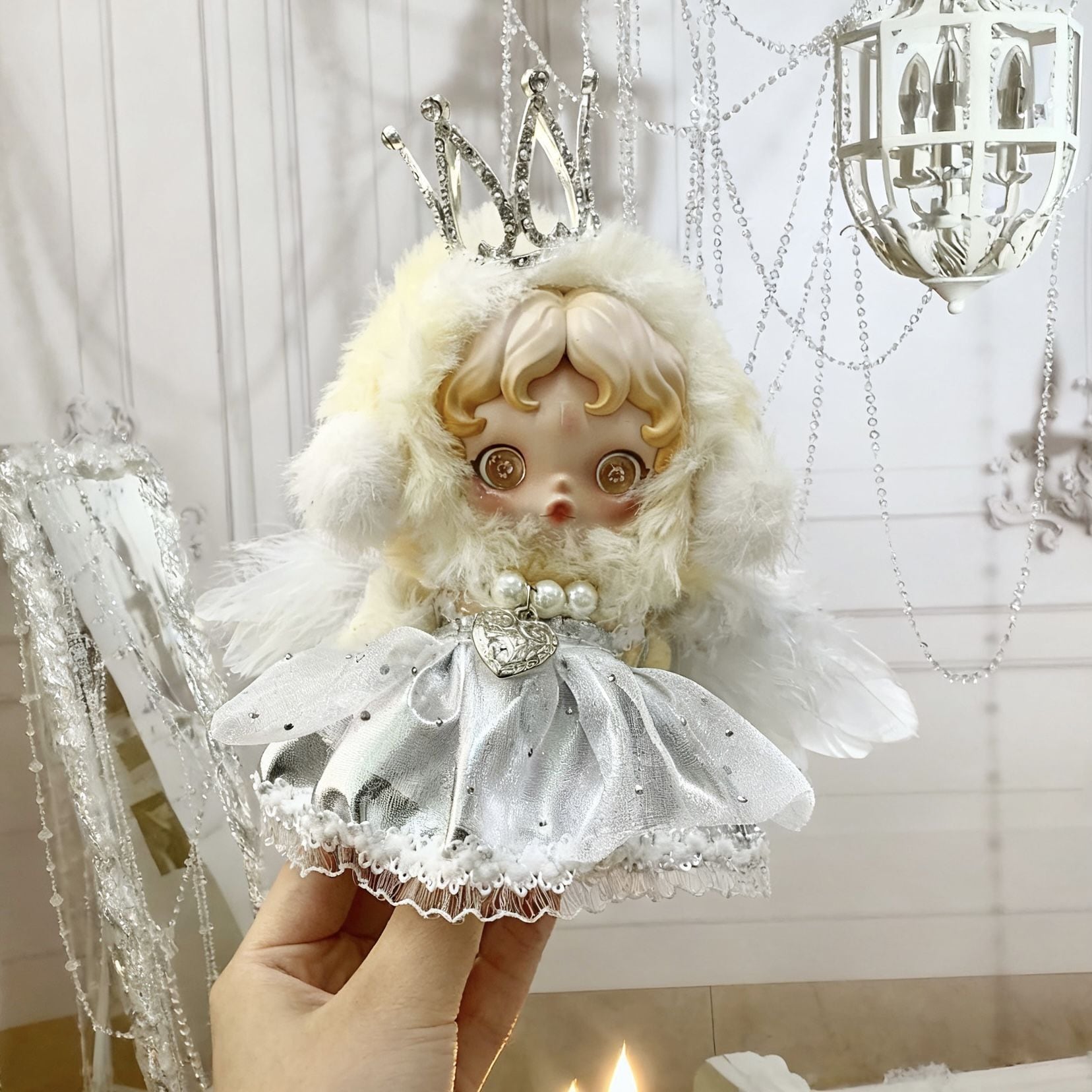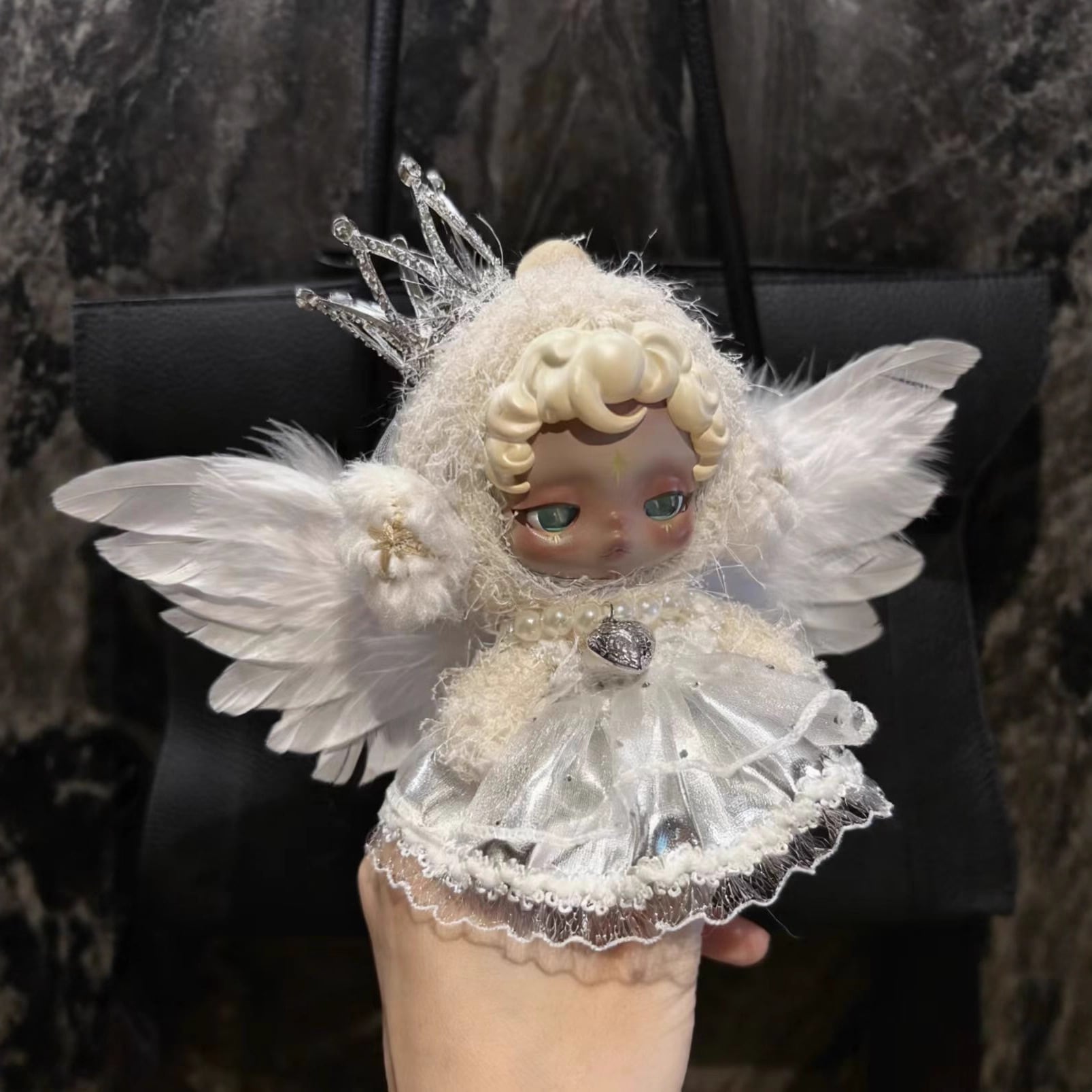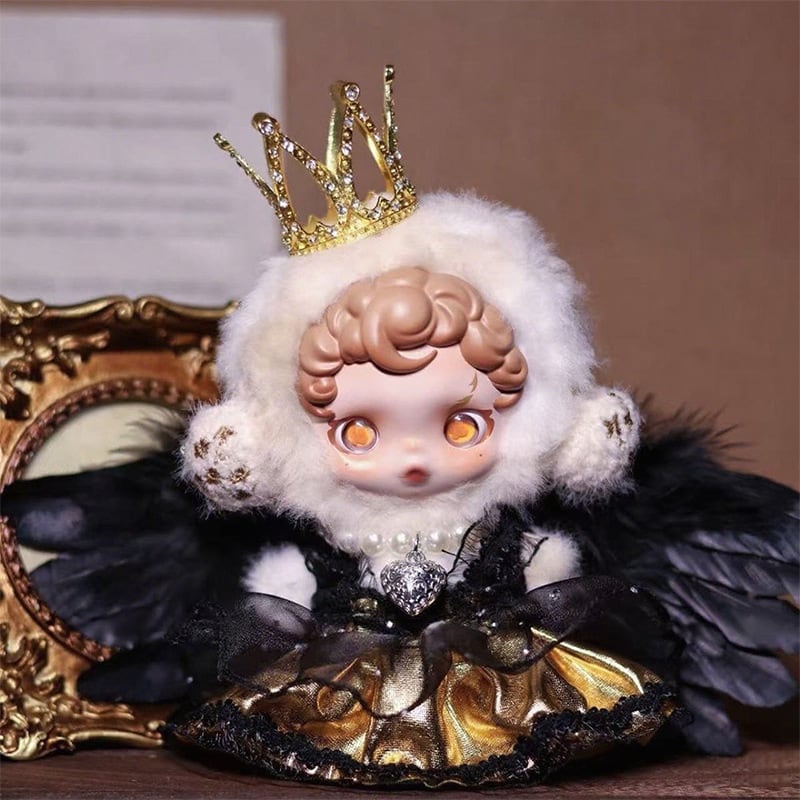 スカルパンダ用 バロック風 光沢チュールワンピース+羽+クラウン+パールネックレス SKULLPANDA ぬいぐるみ 着せ替え 4点セット