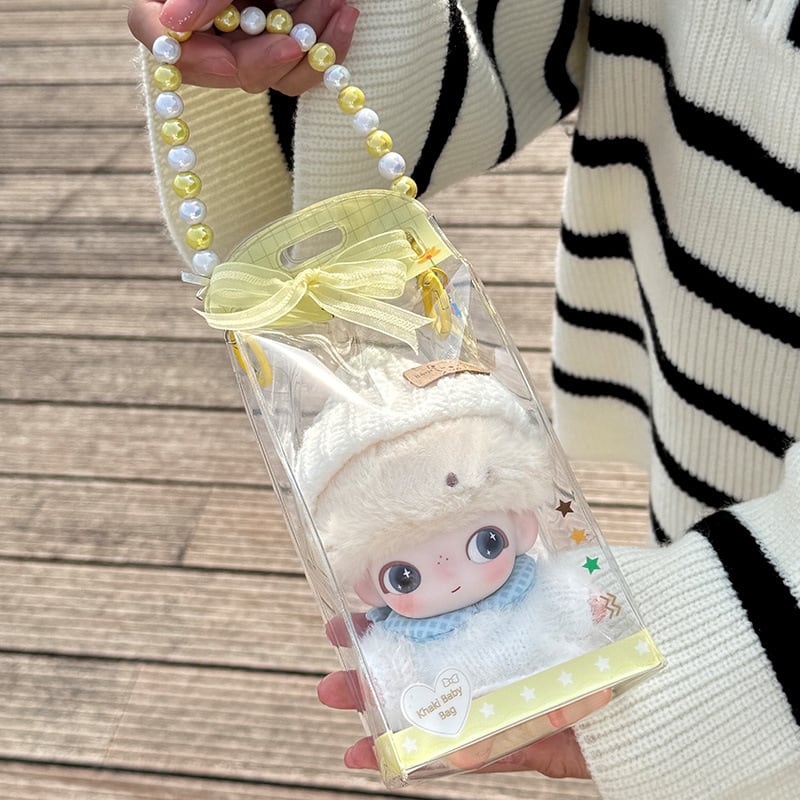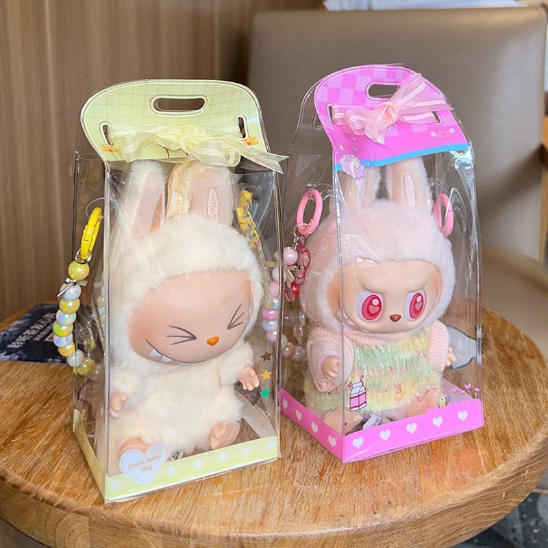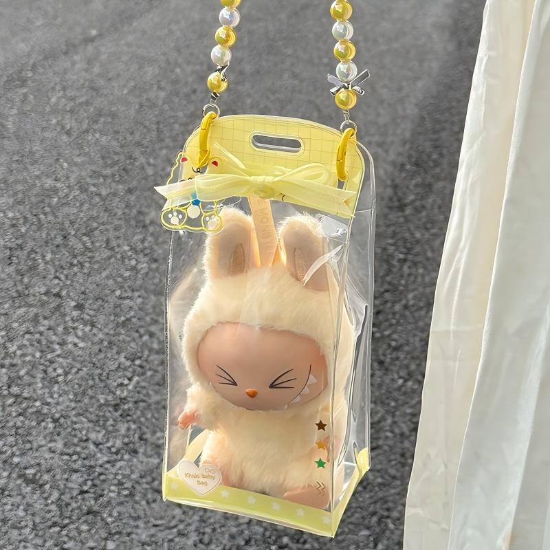 Labubu/Dimoo/15cm用 痛バッグ 透明 PVC 防水 防塵 収納バッグ 持ち運び 日常 保護ケース 手持ちビーズチェーン付き ピンク/イエロー