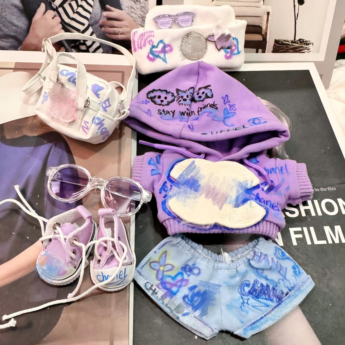 LABUBU 1-3代用 おしゃれ パーカー+デニム+メガネ+靴+帽子+バッグ カジュアル ラブブ ぬいぐるみ 着せ替え衣装 6点セット パープル