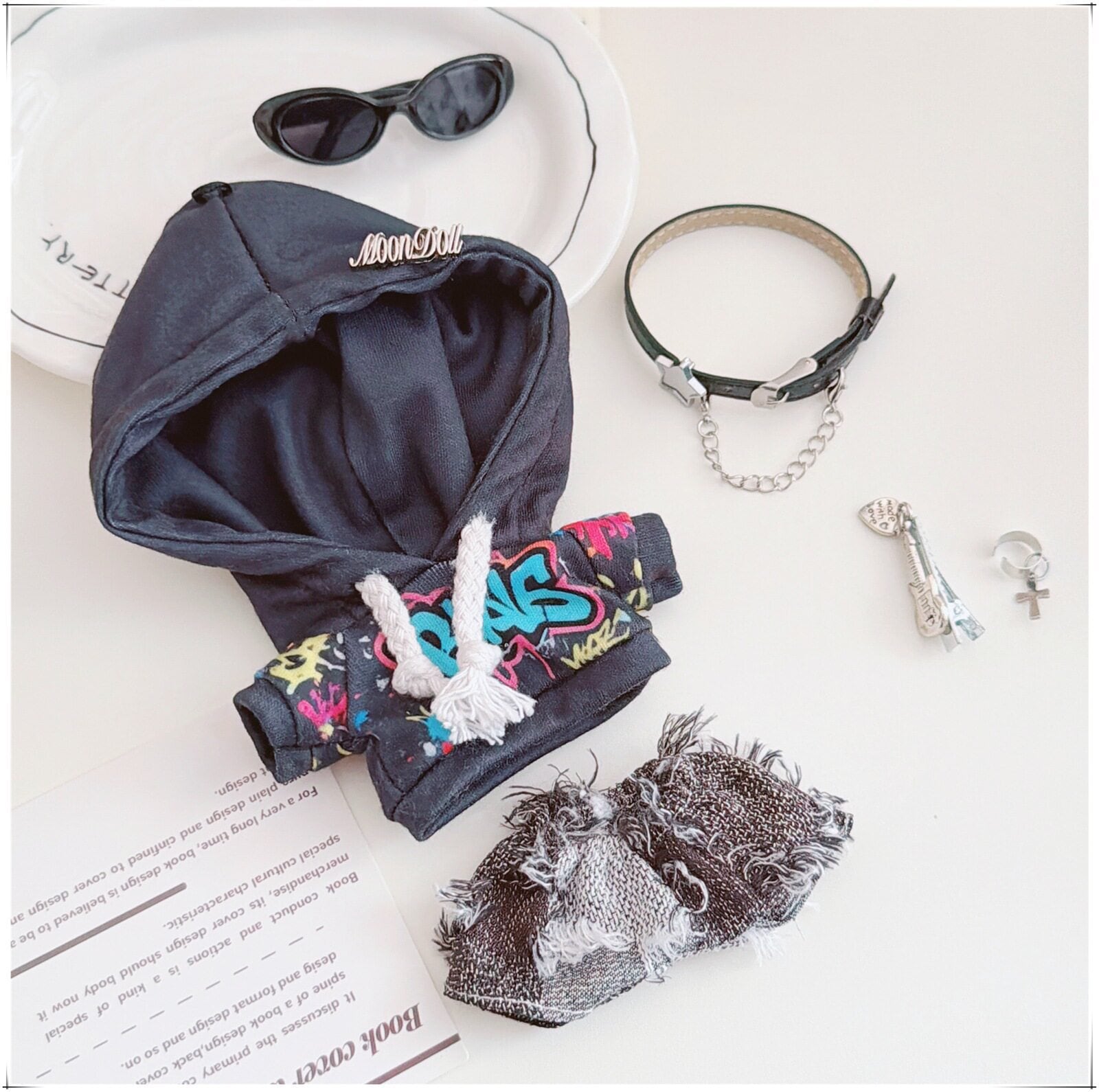 LABUBU 1-3代用 おしゃれ グラフィティパーカー+パンツ+ネックレス+メガネ+ギターチャーム ラブブ ぬいぐるみ 着せ替え衣装 5点セット