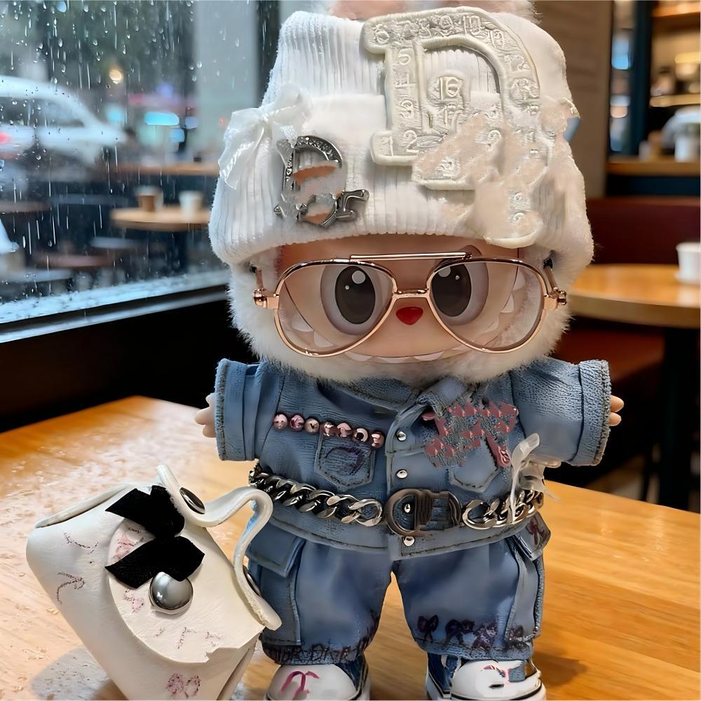 LABUBU 1-3代用 デニムジャケット+パンツ+帽子+メガネ+ベルト+靴 ラブブ ぬいぐるみ おしゃれ 着せ替え衣装 6点セット ブルー