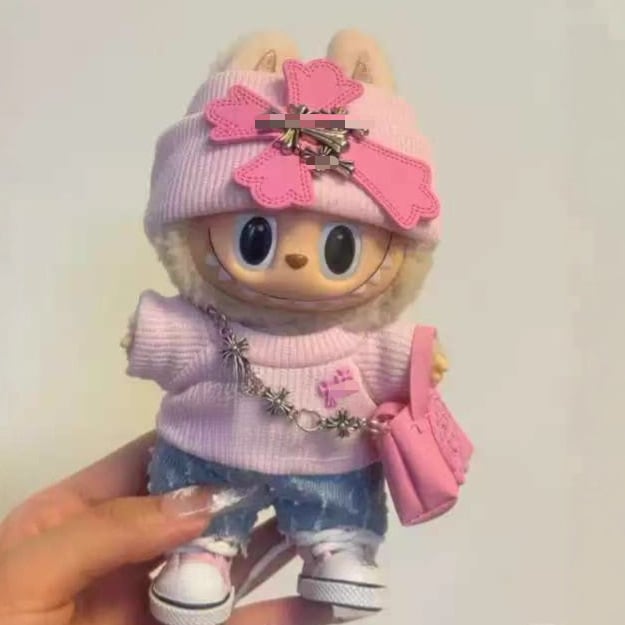 LABUBU 1-3代用 おしゃれ ニットトップス+デニム+靴+バッグ+帽子 ラブブ ぬいぐるみ カジュアル 着せ替え衣装 5点セット ピンク