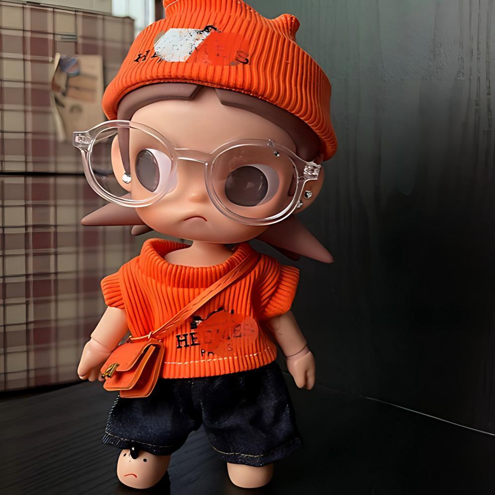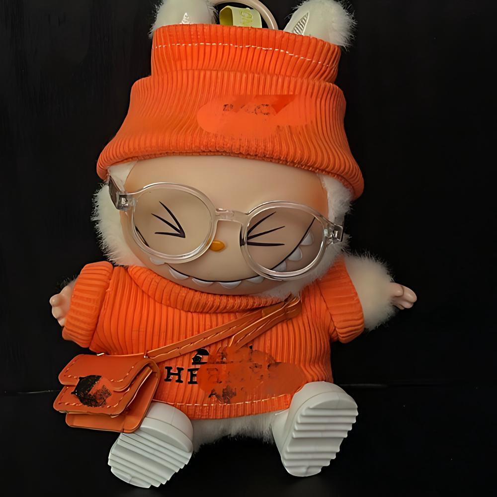 Labubu1-3世代/Zsiga用 カジュアル オレンジ ニットトップス+パンツ+ニット帽+メガネ+バッグ ラブブ ぬいぐるみ 着せ替え 5点セット