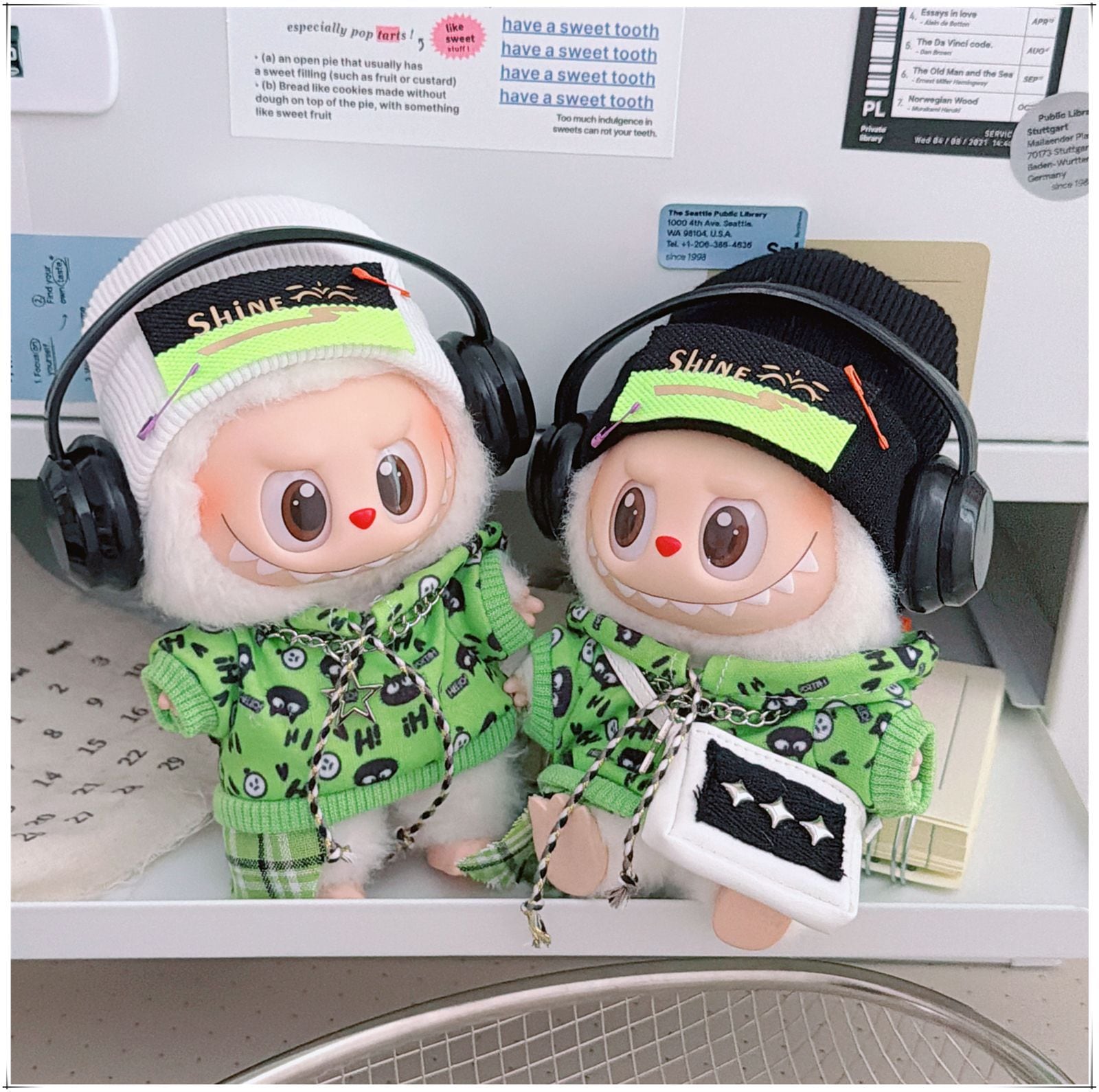 Labubu 1-3世代用 おしゃれ パーカー+パンツ+ニット帽+メガネ+ヘッドフォン+ネックレス+バッグ ラブブ ぬいぐるみ 着せ替え服 7点セット
