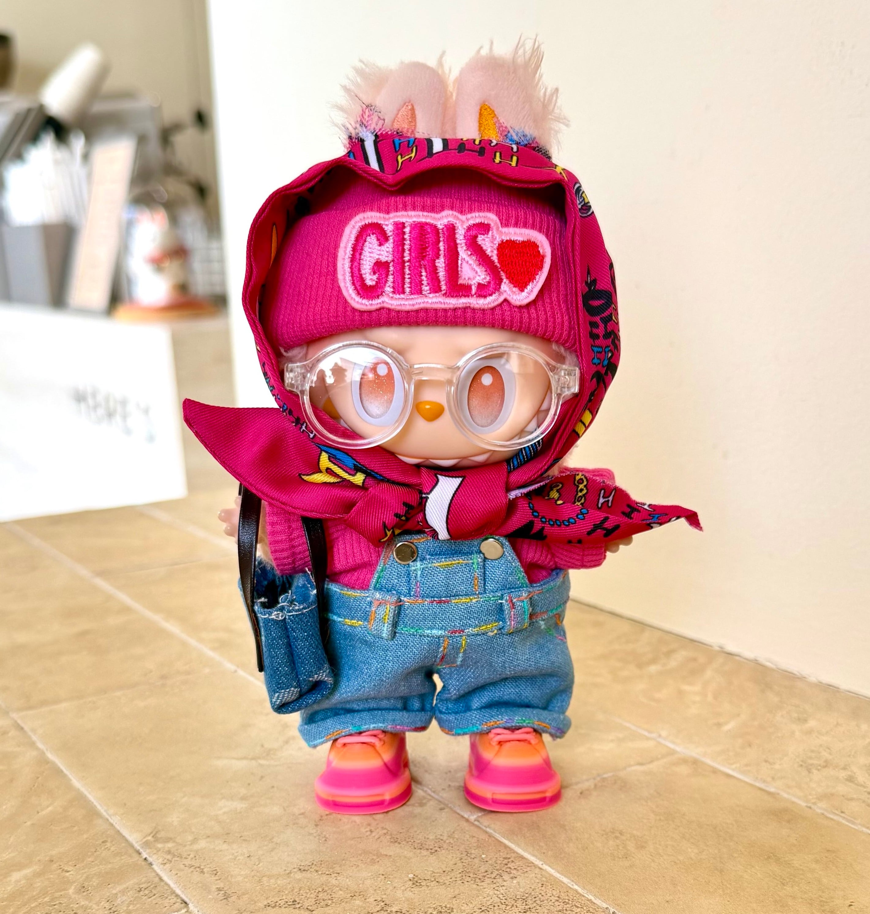 LABUBU 1-3世代用 おしゃれ グラフィティ トップス+サロペット+帽子+マフラー+靴+バッグ+メガネ ラブブ ぬいぐるみ 着せ替え服 7点セット