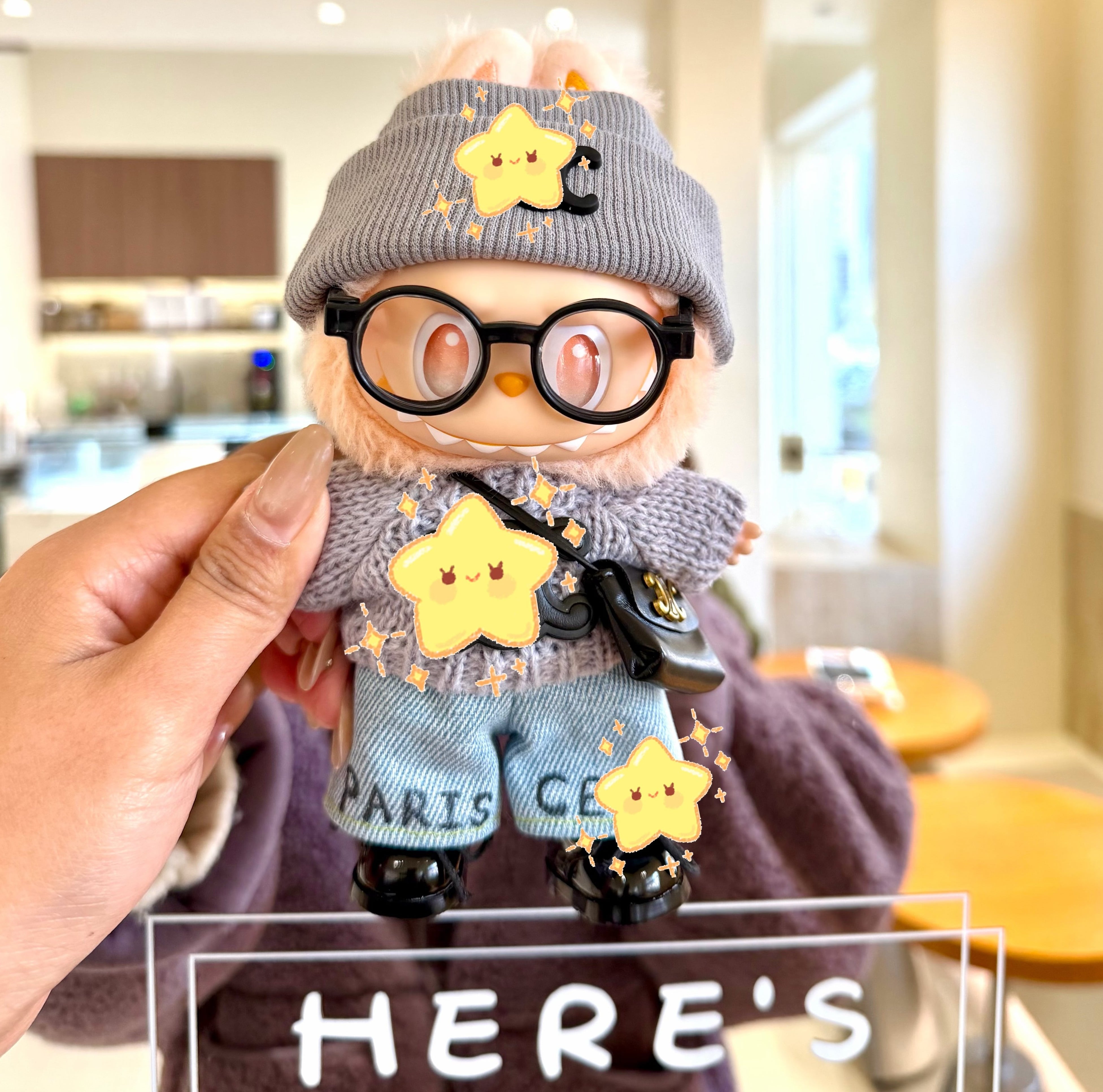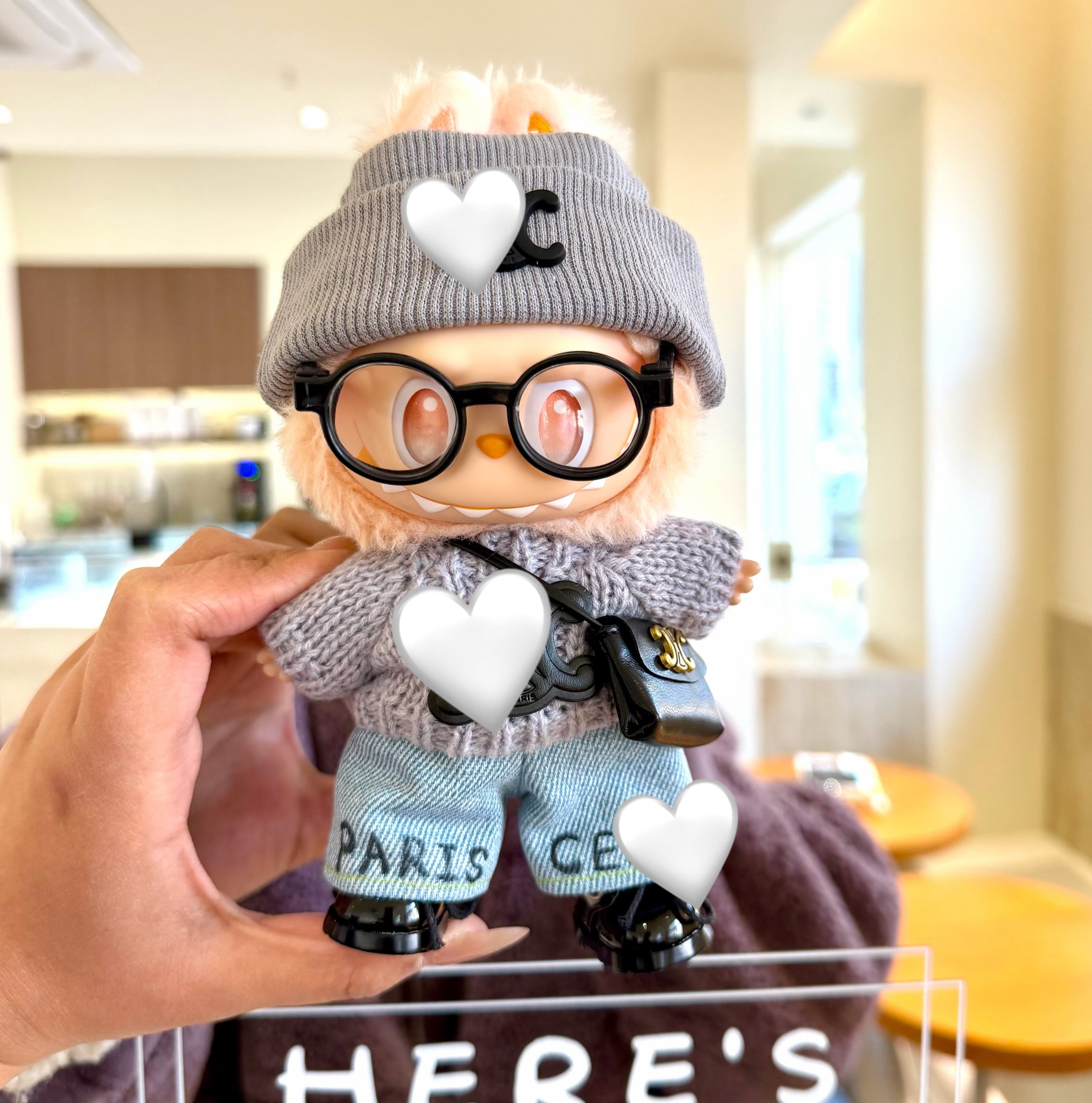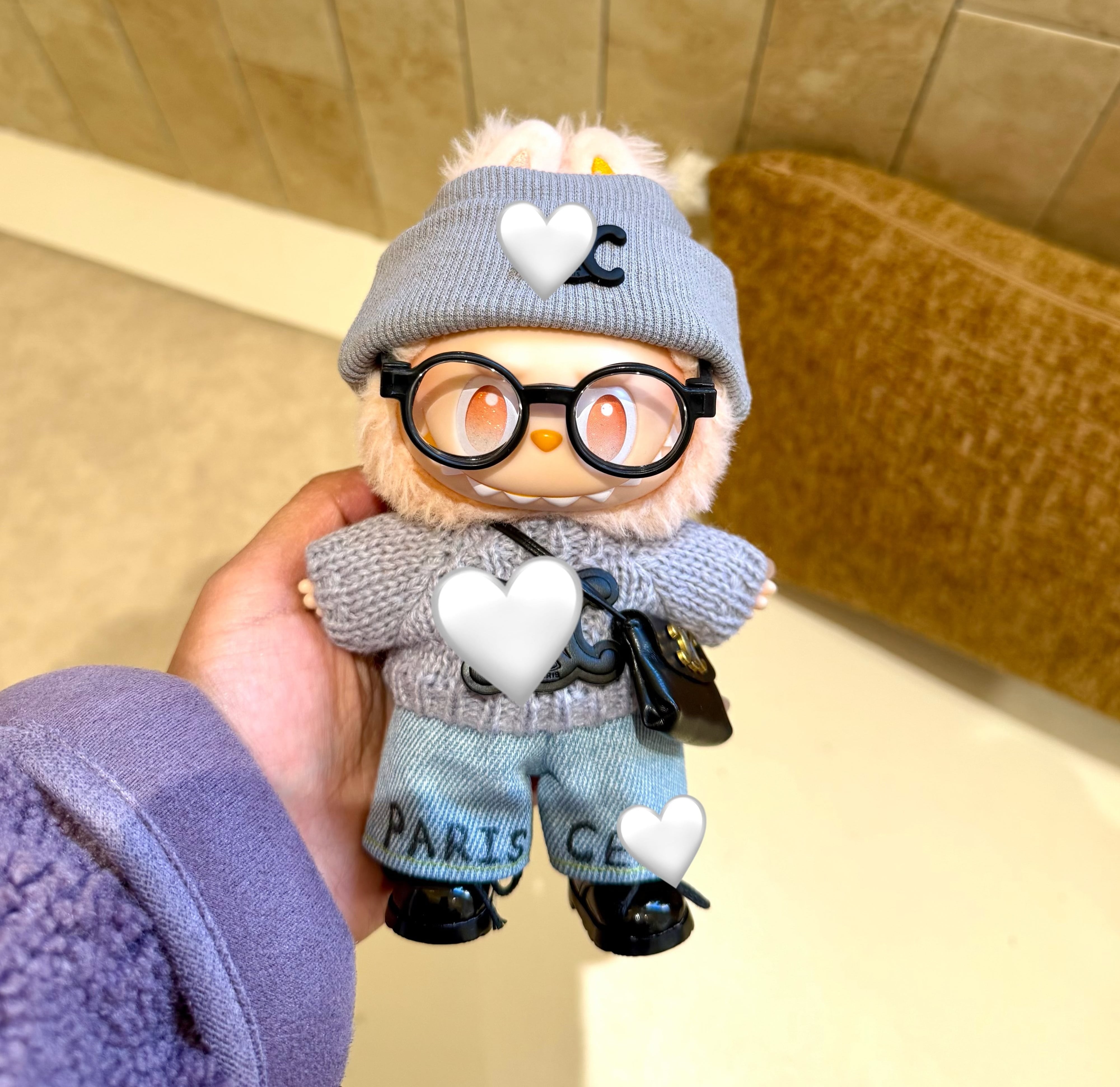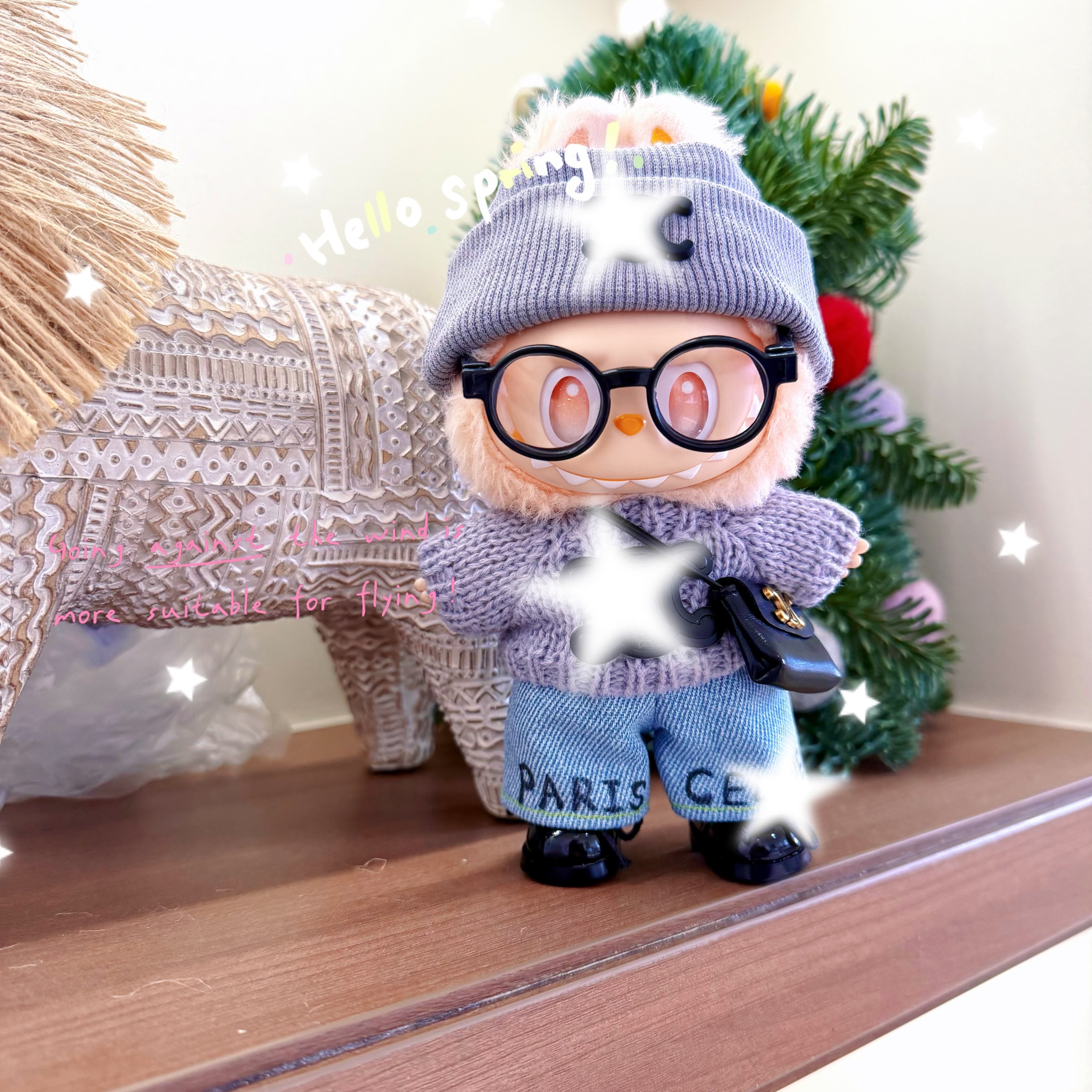 ラブブ 1-3世代用 おしゃれ ニットセーター+デニムパンツ+ニット帽+バッグ+メガネ Labubuぬいぐるみ 着せ替え服 6点セット グレー